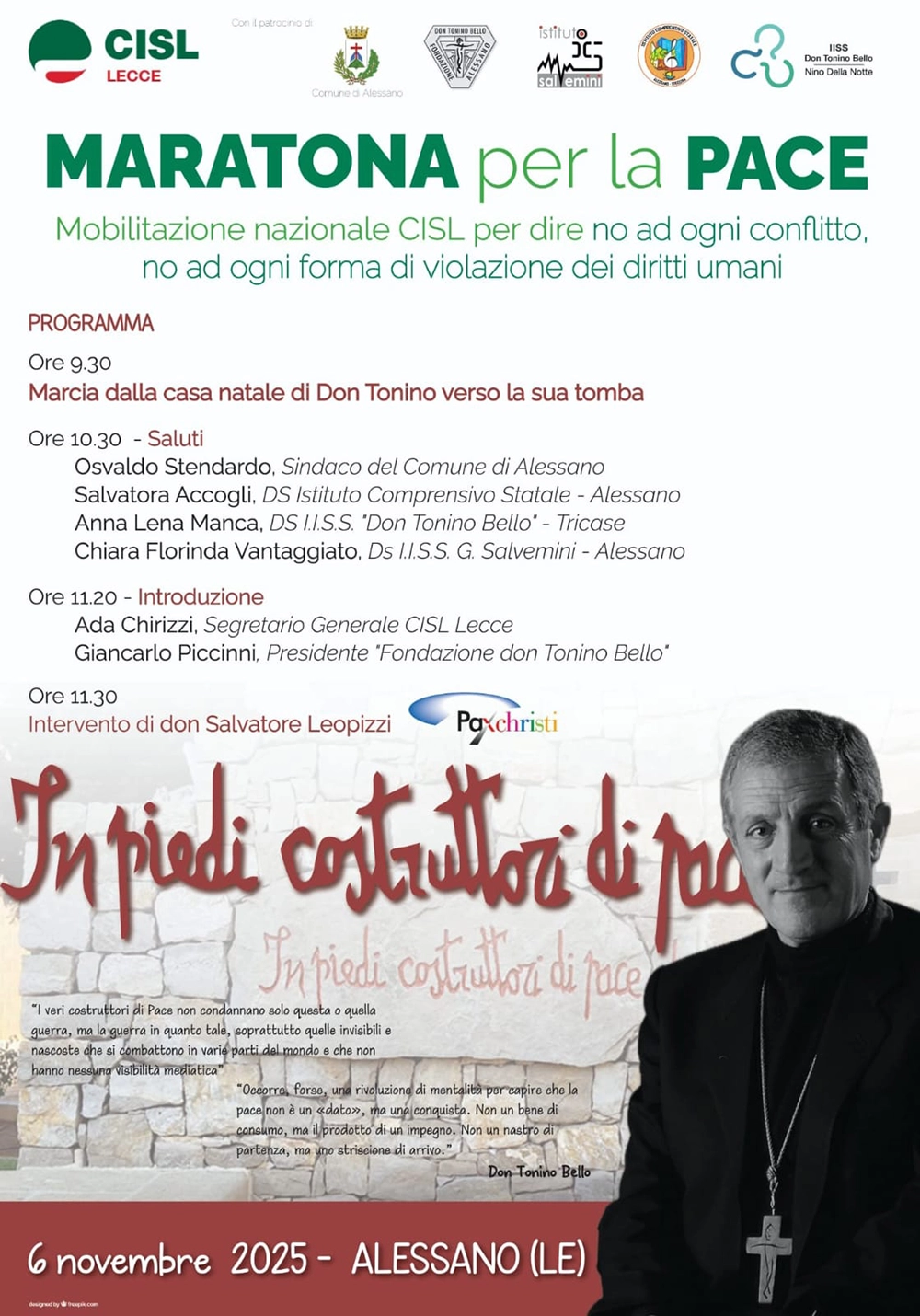 L’evento, promosso dalla CISL di Lecce in collaborazione con il Comune di Alessano, la Fondazione Don Tonino Bello e le istituzioni scolastiche del territorio, è in programma per domani, mercoledì 6 novembre e intende lanciare un chiaro messaggio di rifiuto ad ogni forma di conflitto e violazione dei diritti umani.