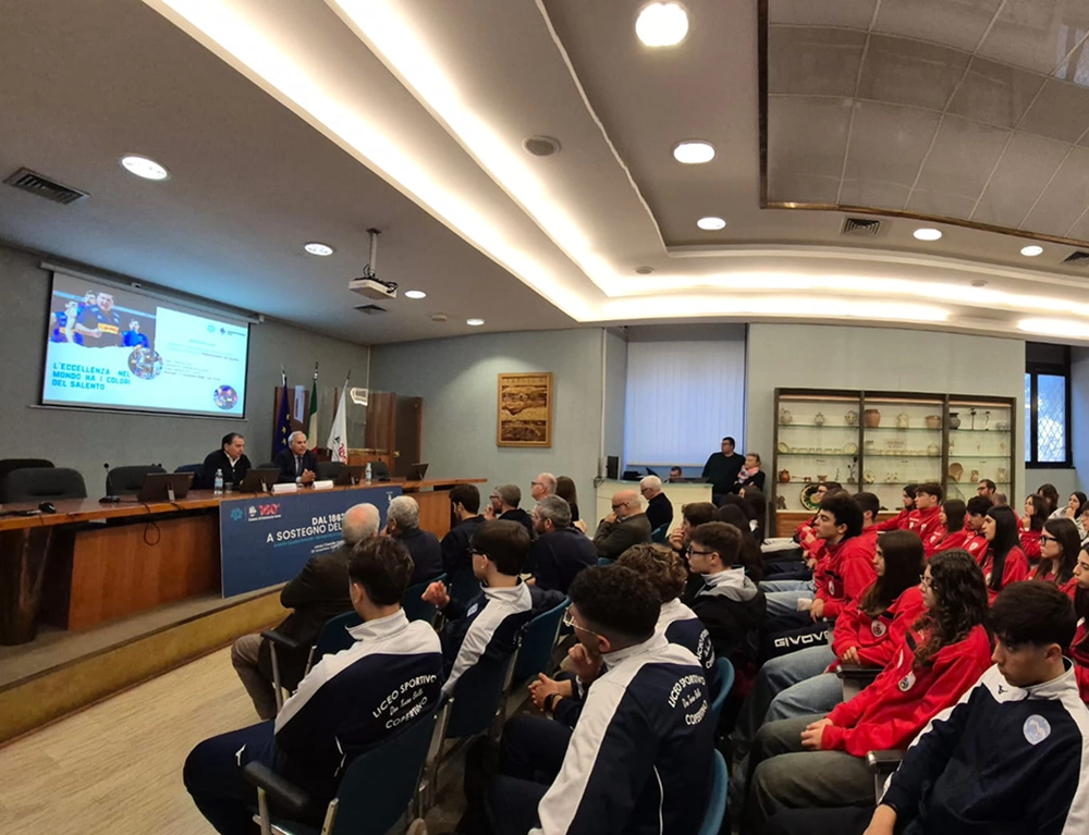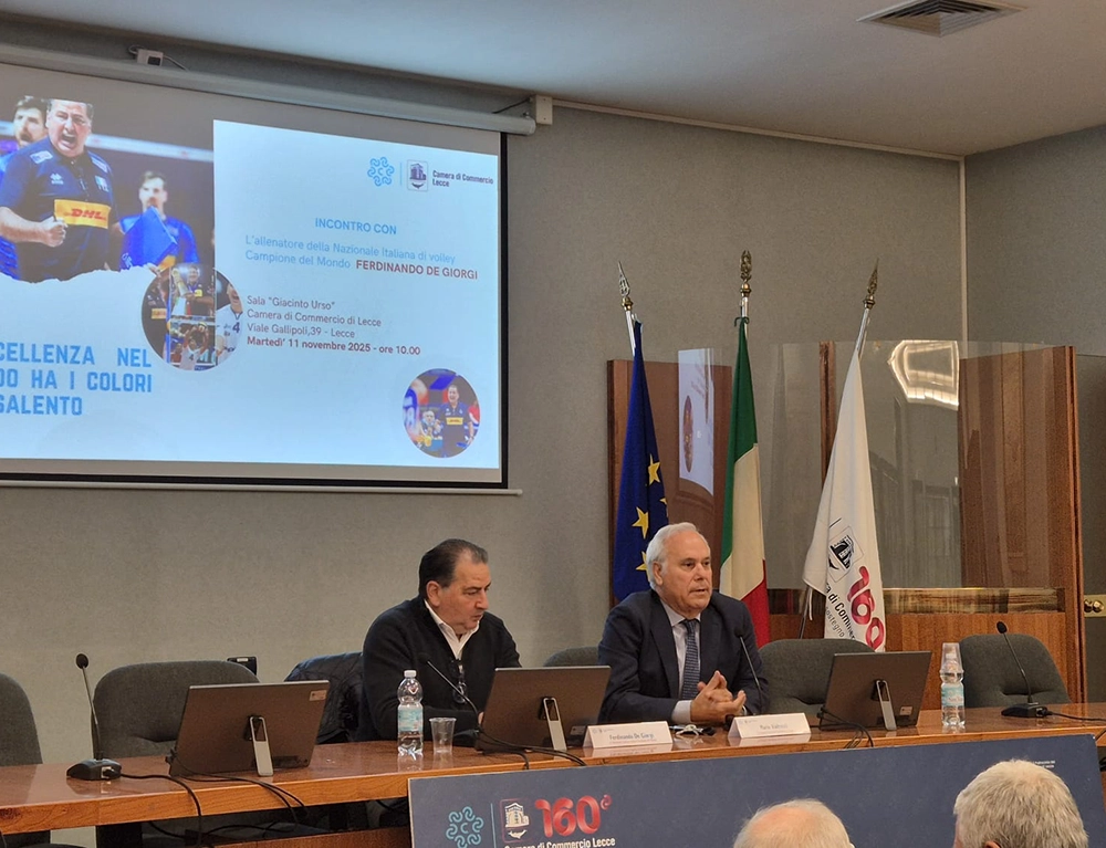 Una grande lezione, di sport e di vita, fuori dalla scuola, per gli alunni di alcune delle classi di licei di Lecce e provincia. Nell’aula, allestita nella Sala “Giacinto Urso” della Camera di Commercio di Lecce, il professor Ferdinando De Giorgi, Fefè per tutti, cinque volte campione del mondo di volley, tre da giocatore e due da allenatore, ha entusiasmato gli studenti dei licei sportivi di Tricase, Maglie, Copertino e Lecce in occasione della consegna, da parte della Camera di Commercio, di una targa a quello che è ormai l’ambasciatore del Salento e della Puglia nel mondo.