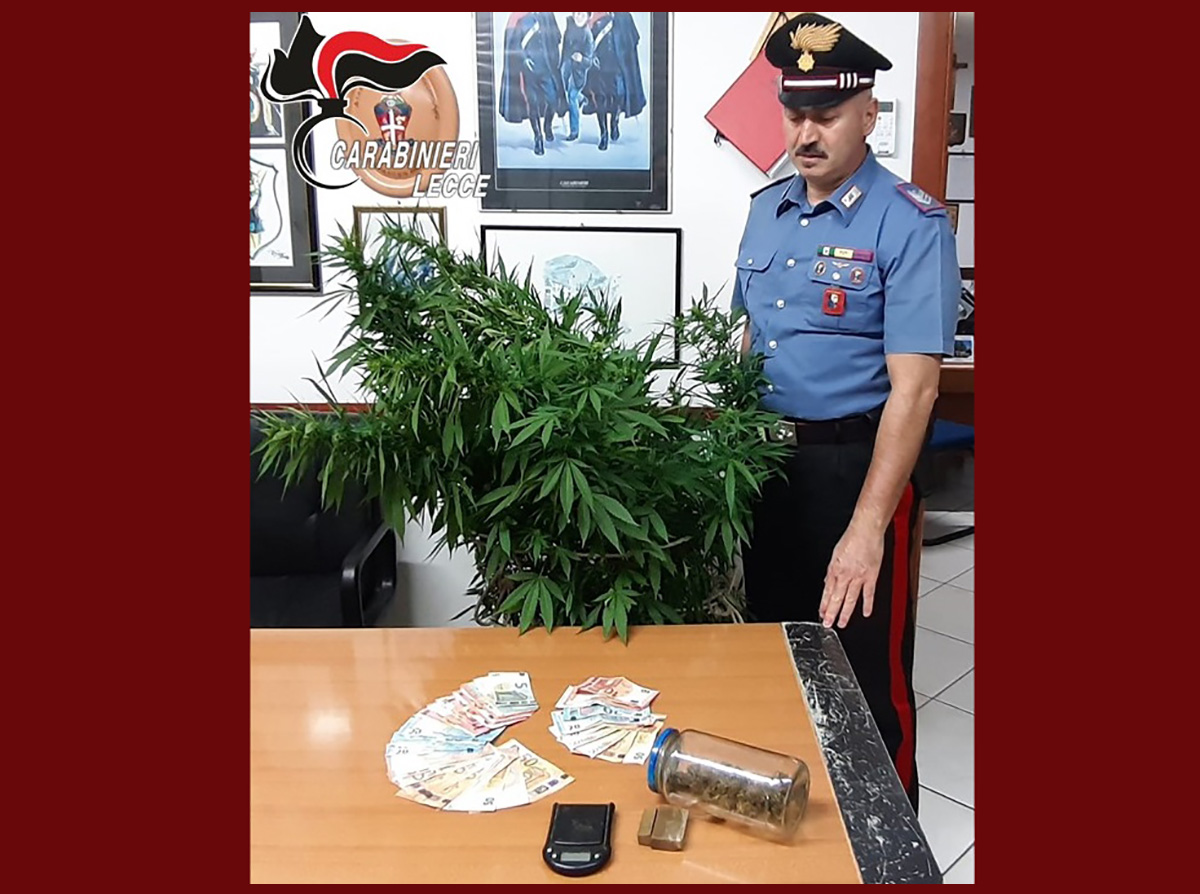È stato trovato in possesso di gr. 50 di hascish, due di cocaina, 20 di di influorescenze canapa, 2 piante invasate di canapa, un bilancino di precisione e 1.315 euro in contanti.