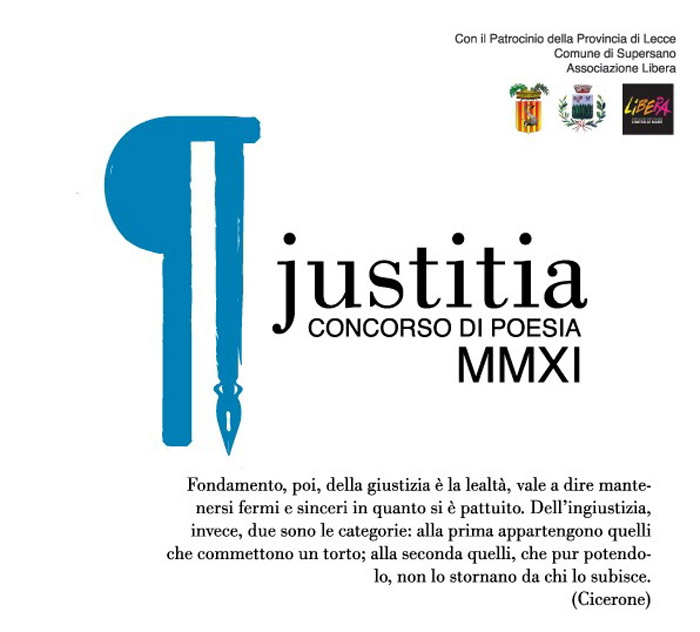 L’Associazione “Rabdomante – Association of Contemporary Art and Culture” di Supersano, con il patrocino della Provincia di Lecce, del Comune di Supersano e con la collaborazione di “Libera – Associazione contro le mafie”, presenta la prima edizione del Concorso di Poesia “Justitia”. In correlazione con il tema annuale dell’Associazione, ossia la legalità, gli elaborati presentati dovranno essere ispirarsi al concetto di giustizia. Il concorso è strutturato per fasce d’età in due sezioni: junior (dai 14 anni ai 19 anni) e senior (dai 20 anni in su), prevede una quota di iscrizione rispettivamente di 5,00 e 10,00 euro e premi in denaro per i primi classificati. Il termine ultimo per l’invio di poesie è il 30 marzo 2011. La premiazione, che avverrà ad aprile, dopo la valutazione degli elaborati da parte di una giuria di esperti del settore, si svolgerà in concomitanza di una conferenza sulla legalità, sempre a curata dall’Associazione Rabdomante. Il bando del concorso con tutte le indicazione utili per partecipare è scaricabile dal sito http://stendhaal.altervista.org/. Per ulteriori informazioni è possibile contattare l’Associazione alla casella mail rabdomanzia@gmail.com.