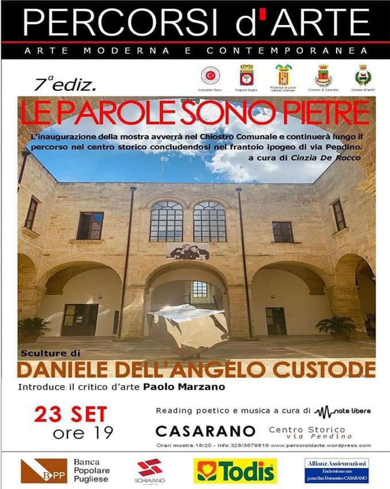 La kermesse verrà ufficialmente aperta venerdì 23 settembre (ore 19) dall’inaugurazione della mostra di scultura dell’artista Daniele Dell’Angelo Custode, all’interno del settecentesco Chiostro Comunale. Inaugurazione presentata dal critico d’arte Paolo Marzano.