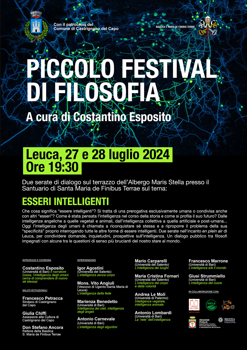 Dopo i saluti istituzionali di Francesco Petracca (sindaco di Castrignano del Capo) e Giulia Chiffi (assessore alla Cultura di Castrignano del Capo) si alterneranno gli interventi di Igor Agostini (Università del Salento) su “L’intelligenza senza corpo”, Mons. Vito Angiuli (Vescovo di Ugento-Santa Maria di Leuca) su “L’intelligenza della fede”, Marienza Benedetto (Università di Bari) su “Intelligenza dei cieli, intelligenza degli angeli”, Antonio Carnevale (Università di Bari) su “L’intelligenza degli algoritmi”, Mario Carparelli (Università del Salento) su “L’intelligenza dei luoghi”, Maria Cristina Fornari (Università del Salento) su “L’intelligenza del corpo e della volontà”, Andrea Le Moli (Università di Palermo) su “Intelligenza vegetale, intelligenza animale”, Antonio Lombardi (Università di Bari) su “La ‘rete’ dell’intelligenza”, Francesco Marrone (Università di Bari) su “L’intelligenza e/è il mondo” e Giusi Strummiello (Università di Bari) su “L’intelligenza del cuore”.