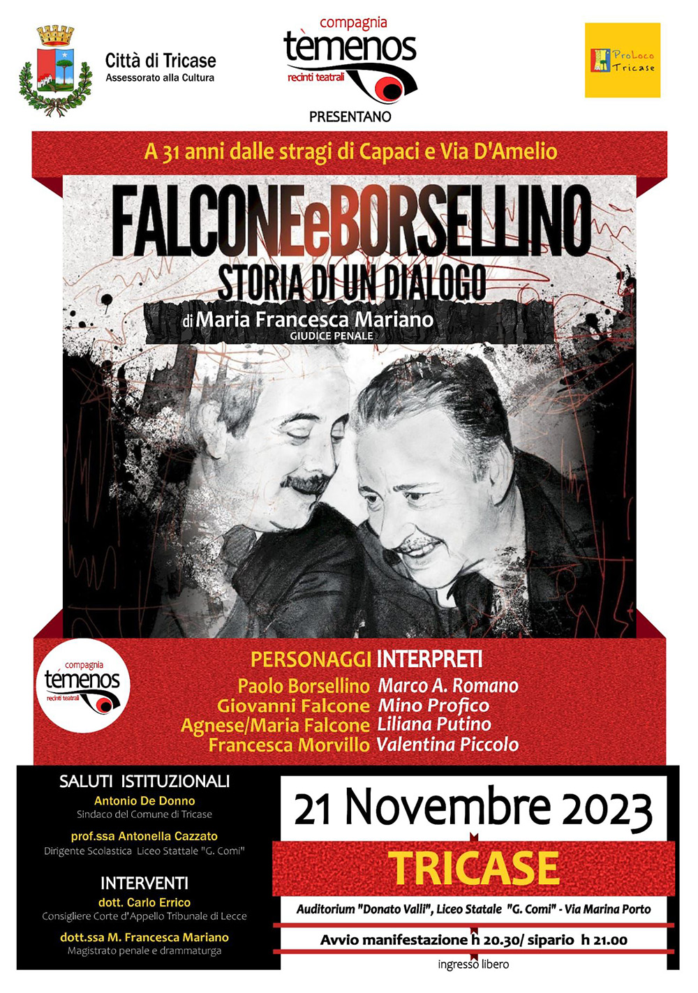 A 31 dalle stragi di Capaci e via D’Amelio, su iniziativa dell’amministrazione comunale e della locale ProLoco, la compagnia “Temenos-recinti teatrali” propone anche a Tricase, (domani sera, dalle ore 20,30 nell’auditorium “Donato Valli” del Liceo “Comi”), “Falcone e Borsellino storia di un dialogo”, spettacolo tratto dal testo teatrale di Maria Francesca Mariano, magistrato della Corte di Assise di Lecce, impegnata fin dalla sua esperienza in Sicilia, nella lotta alla criminalità organizzata ed il cui testo è stato adottato del centro studi Paolo Borsellino di Palermo, cresciuto sotto l’ala protettrice di Rita Borsellino.