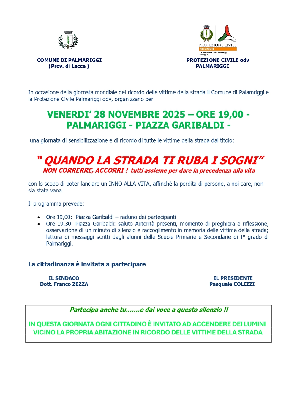 Come accade da oltre 10 anni, la Protezione Civile di Palmariggi odv in collaborazione con i Comuni di Palmariggi e Bagnolo del Salento organizza una serata a ricordo delle vittime della strada.
