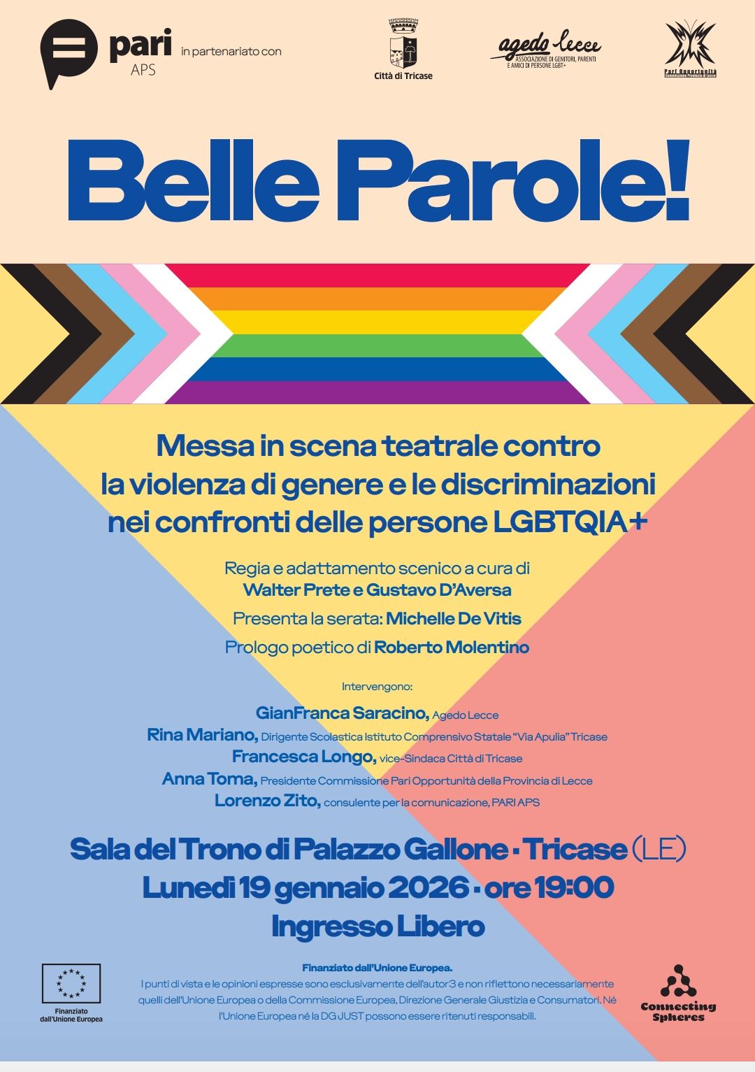 “Belle Parole!” è il titolo dell’opera teatrale che andrà per la prima volta in scena il prossimo lunedì 19 gennaio, presso la Sala del Trono di Tricase (inizio ore 18:45, ingresso libero), frutto di un percorso laboratoriale curato dagli esperti formatori Walter Prete e Gustavo D’Aversa e parte integrante del progetto Altritudini, vincitore del bando “Connecting Spheres” Oxfam Italia, finanziato dall’Unione Europea.