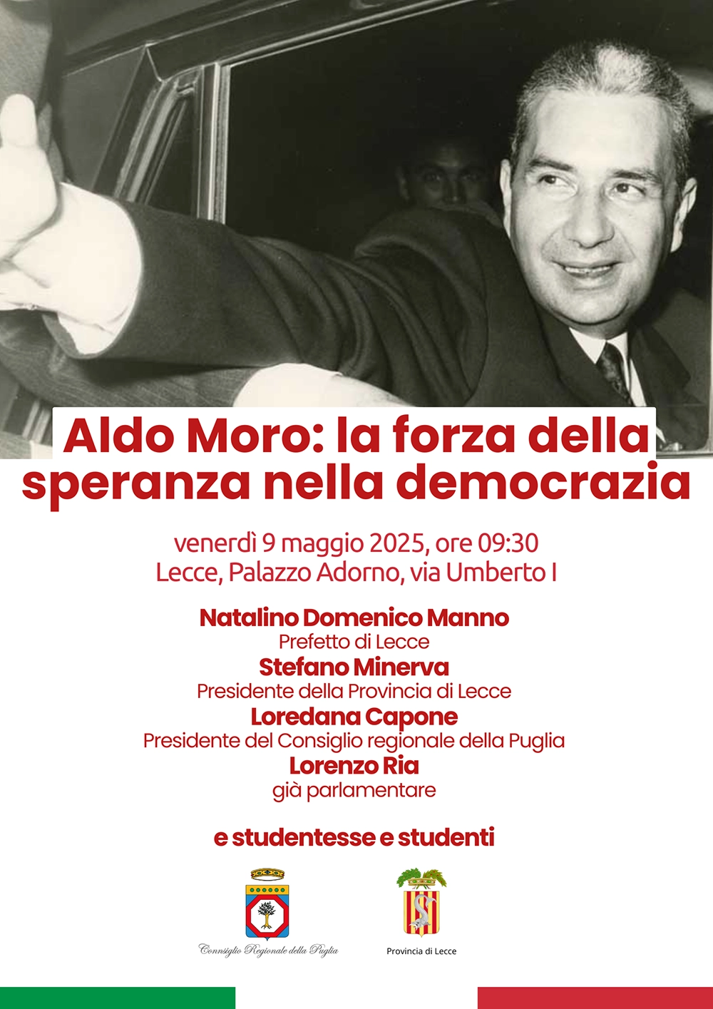In occasione del 47° anniversario della morte di Aldo Moro, il Consiglio regionale della Puglia, in condivisione con la Provincia di Lecce, celebra a Lecce, sua provincia d’origine, il ricordo del grande statista magliese.