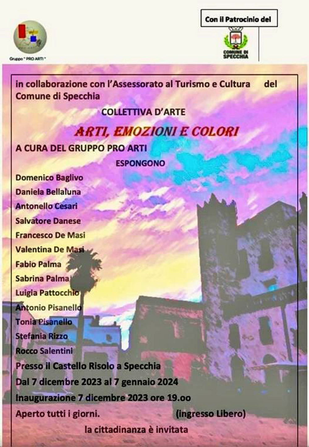 A Palazzo Risolo di Specchia saranno esposte le opere di Domenico Baglivo, Daniela Bellaluna, Antonello Cesari, Salvatore Danese, Francesco De Masi, Valentina De Masi, Fabio Palma, Sabrina Palma, Luigia Pattocchio, Antonio Pisanello, Tonia Pisanello, Stefania Rizzo e Rocco Salentini.
