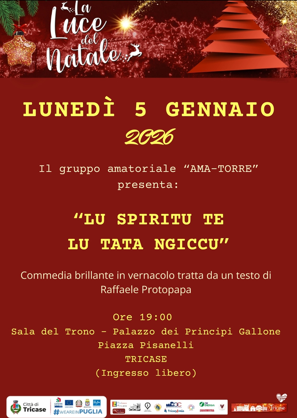 La Sala del Trono del Palazzo dei Principi Gallone di Tricase si veste straordinariamente a teatro per ospitare il gruppo amatoriale Ama-Torre con una commedia brillante in vernacolo tratta da un testo di Raffaele Protopapa: Lu spirito te lu tata Ngiccu.
