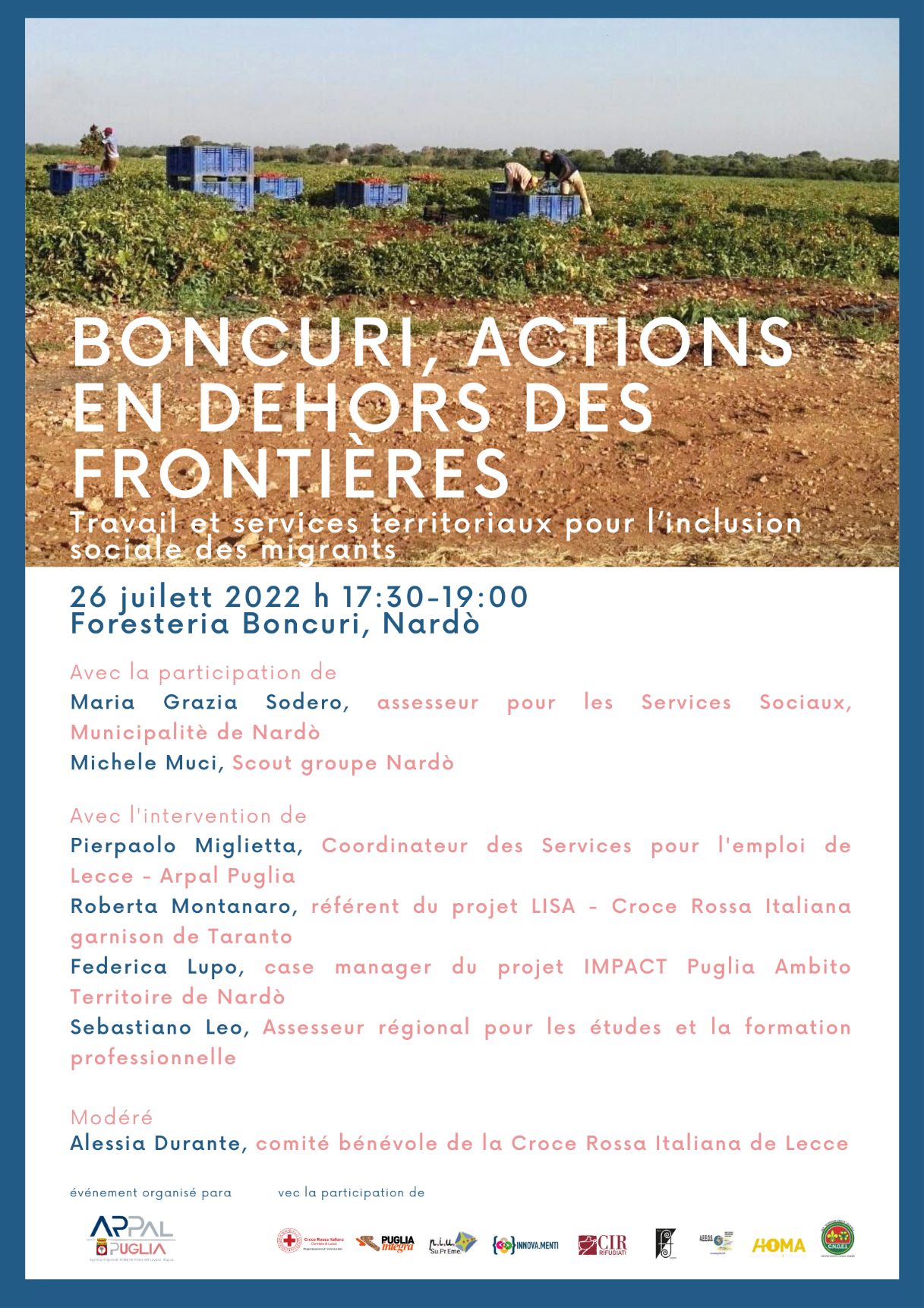 Si scrive LISA, si legge Lavoro, Inclusione, Sviluppo, Autonomia. È il progetto che la Croce Rossa Italiana esporrà durante l’incontro di oggi a Boncuri: supportato e patrocinato dal Ministero del Lavoro e delle Politiche Sociali, è sviluppato da 21 presidi CRI attivi in tutta Italia, compreso il Salento, e vede impegnati oltre 800 volontari adeguatamente formati.