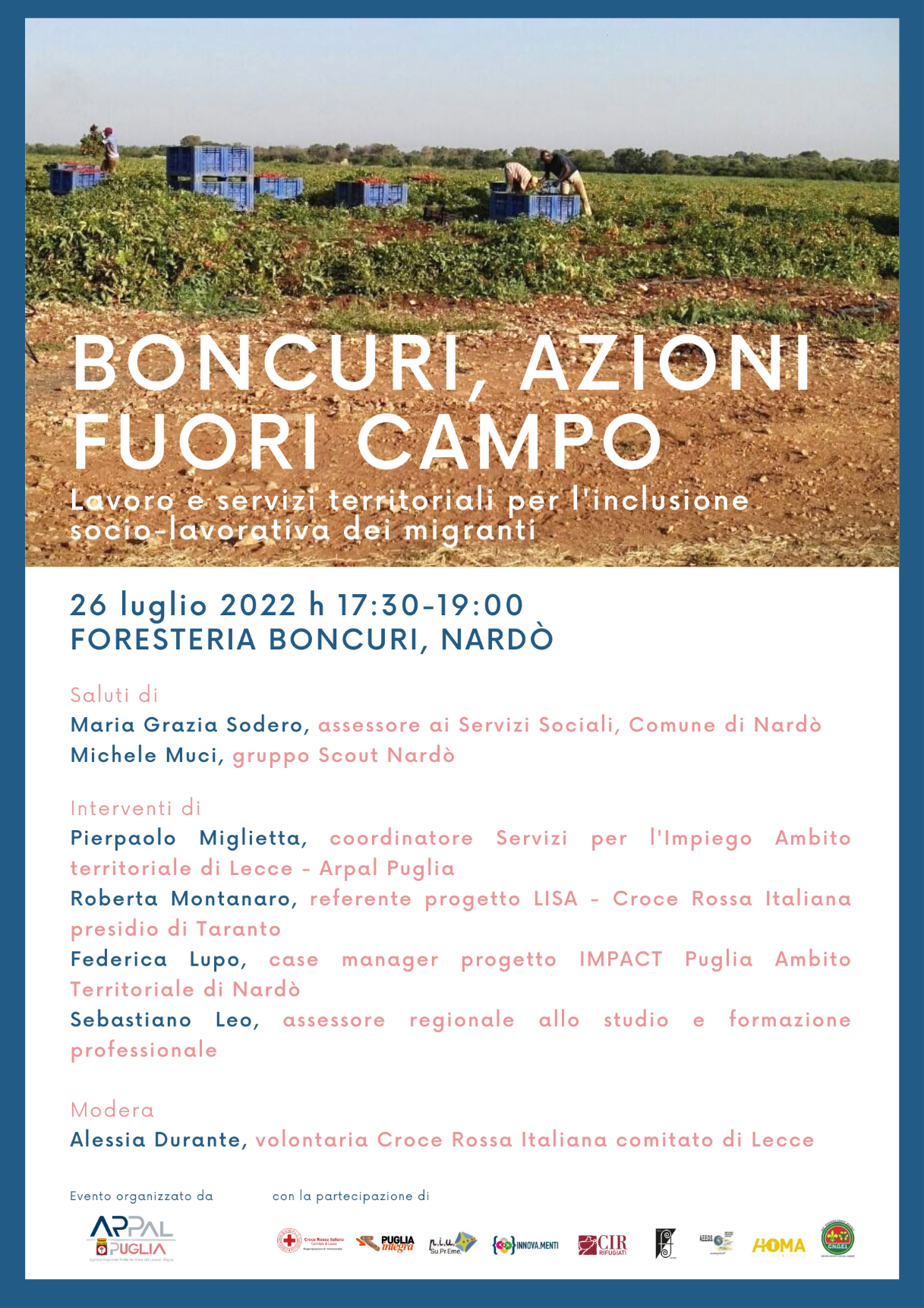 È lì che questo pomeriggio, dalle 17,30 alle 19, si terrà “Boncuri, azioni fuori campo”, incontro organizzato per presentare in maniera approfondita i servizi già offerti in queste prime settimane e che saranno implementati in quelle a venire. L’evento si rivolge soprattutto ai lavoratori stagionali presenti in zona per la raccolta delle angurie e dei pomodori. L’iniziativa è promossa e organizzata dall’Ufficio coordinamento Servizi per l’Impiego Ambito territoriale di Lecce di Arpal Puglia e Centro per l’Impiego di Nardò, con la preziosa collaborazione di Gruppo Scout CNGEI Nardò, Croce Rossa, IMPACT Puglia, P.I.U. Su.Pr.Eme., Innovamenti, CIR Rifugiati, Finis Terrae, AEEOS Associazione Onlus, Homa Community Housing.