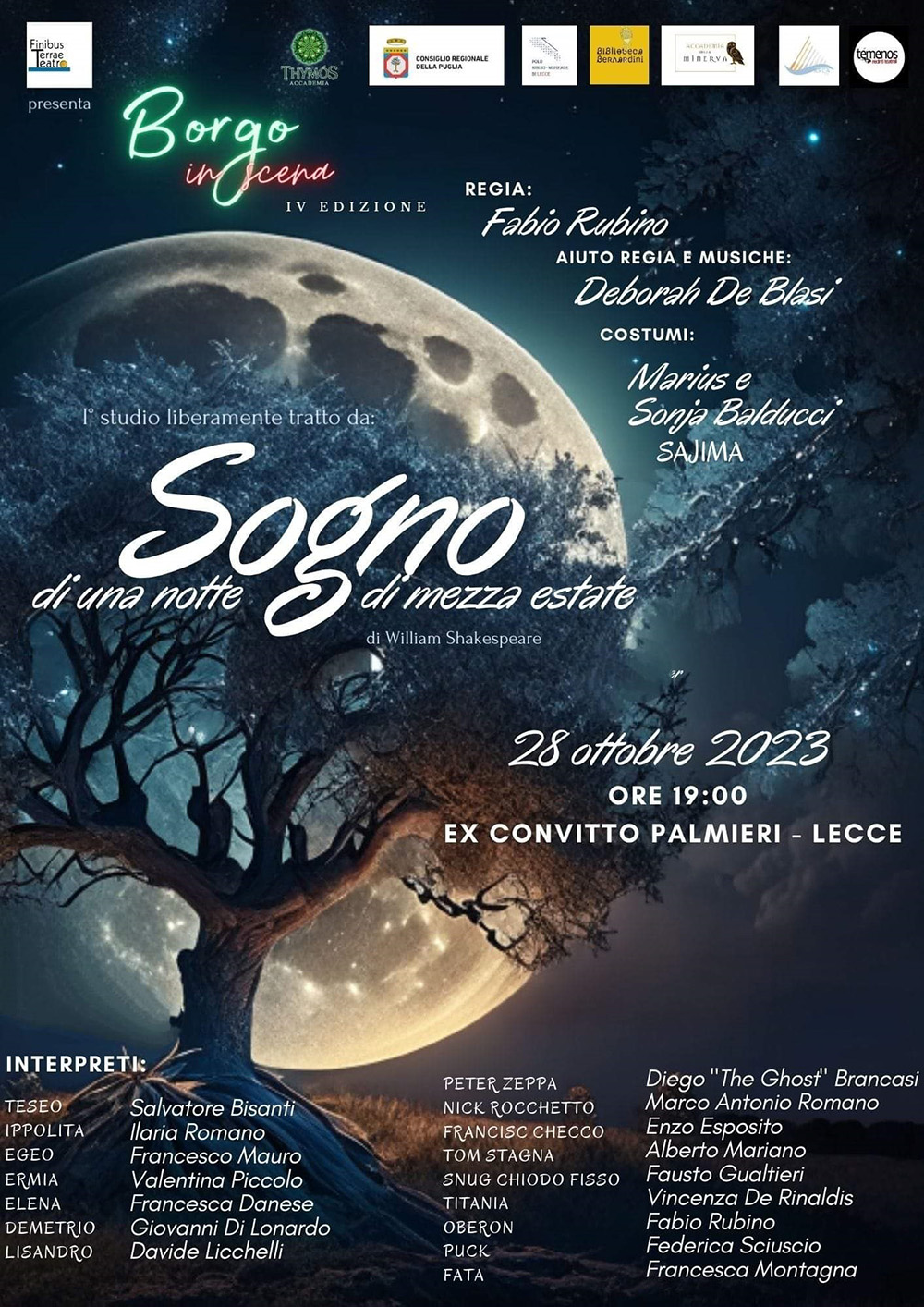 Primo studio liberamente tratto dal sogno shakespeariano: appuntamento con la rassegna nazionale Borgo in Scena diretta da Accademia Thymós, sabato 28 ottobre, alle ore 19, presso l’Atrio del Convitto Palmieri