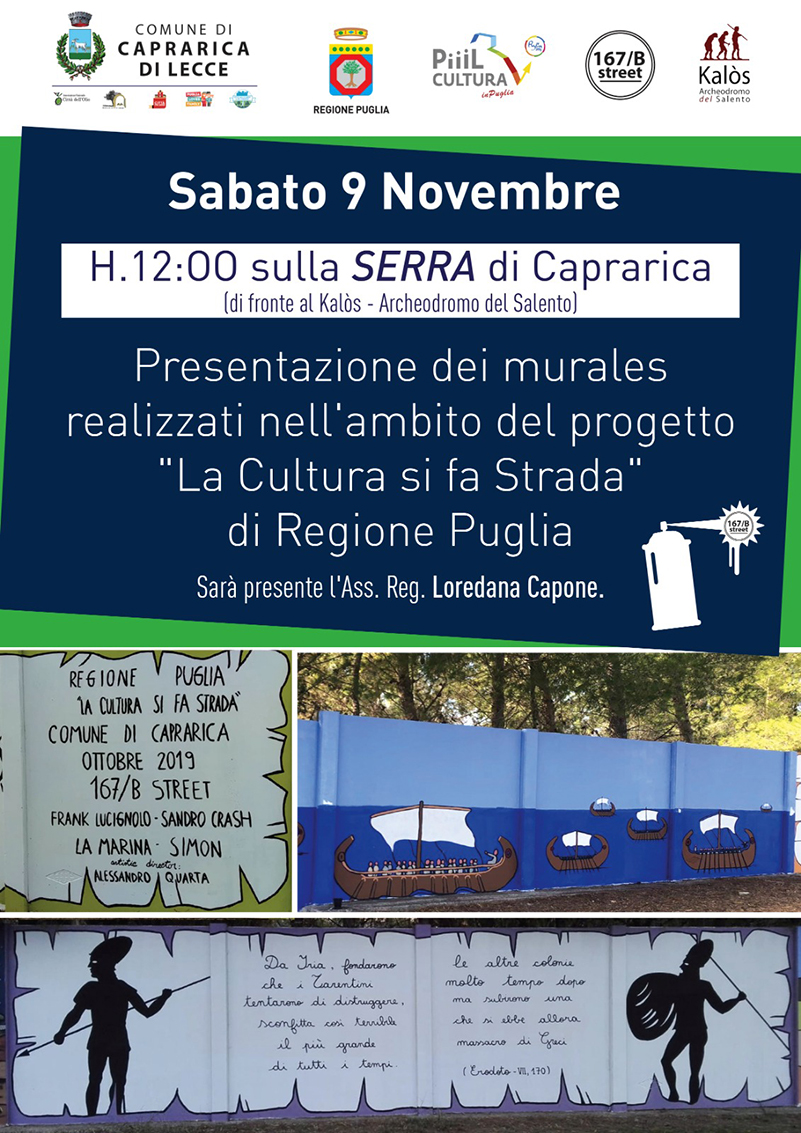Appuntamento domani a mezzogiorno presso il Kalòs, Archeodromo del Salento, dove alla presenza dell’Assessore Regionale Loredana Capone, sarà presentato il murales realizzato nell’ambito del programma di Regione Puglia – La Cultura si fa Strada.