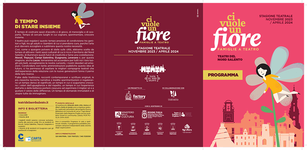 “Ci vuole un fiore – Famiglie a teatro” fa parte del progetto Teatri del nord Salento, promosso da Factory Compagnia Transadriatica in collaborazione con BlaBlaBla, con il sostegno di Ministero della Cultura, Regione Puglia, Teatro Pubblico Pugliese, delle amministrazioni comunali di Campi Salentina, Guagnano, Lecce, Leverano, Novoli, Trepuzzi e della Biblioteca OgniBene di Lecce.