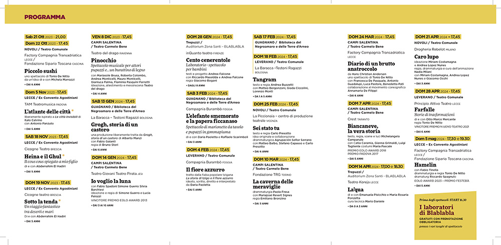 «È tempo di costruire spazi d’ascolto e di gioco, di meraviglia e di scoperta. Tempo di cercare luoghi in cui sognare, sperimentare, crescere insieme. Il teatro può regalarci questo tempo prezioso di condivisione tra genitori e figli, tra gli adulti e i bambini di cui si prendono cura, perché l’arte può davvero accogliere e sublimare questa nostra necessità», spiega il direttore artistico Tonio De Nitto, che prosegue: «Condividere con tante amministrazioni pubbliche un’idea di futuro, ci ha permesso di ospitare le migliori compagnie teatrali che dell’esperienza della relazione con le nuove generazioni fanno il perno della loro ricerca. Fiabe della tradizione, racconti contemporanei e scritture originali, le più classiche tecniche narrative e inedite sperimentazioni ci regaleranno un tempo denso di significati, un tempo in cui ci auguriamo crescano i valori dell’uguaglianza e del rispetto, un tempo in cui l’esperienza dell’arte e della bellezza porterà ciascuno ad esprimere il miglior sé e a gustare il valore delle differenze. Un tempo di domande immutabili e di utopie tutte da immaginare».