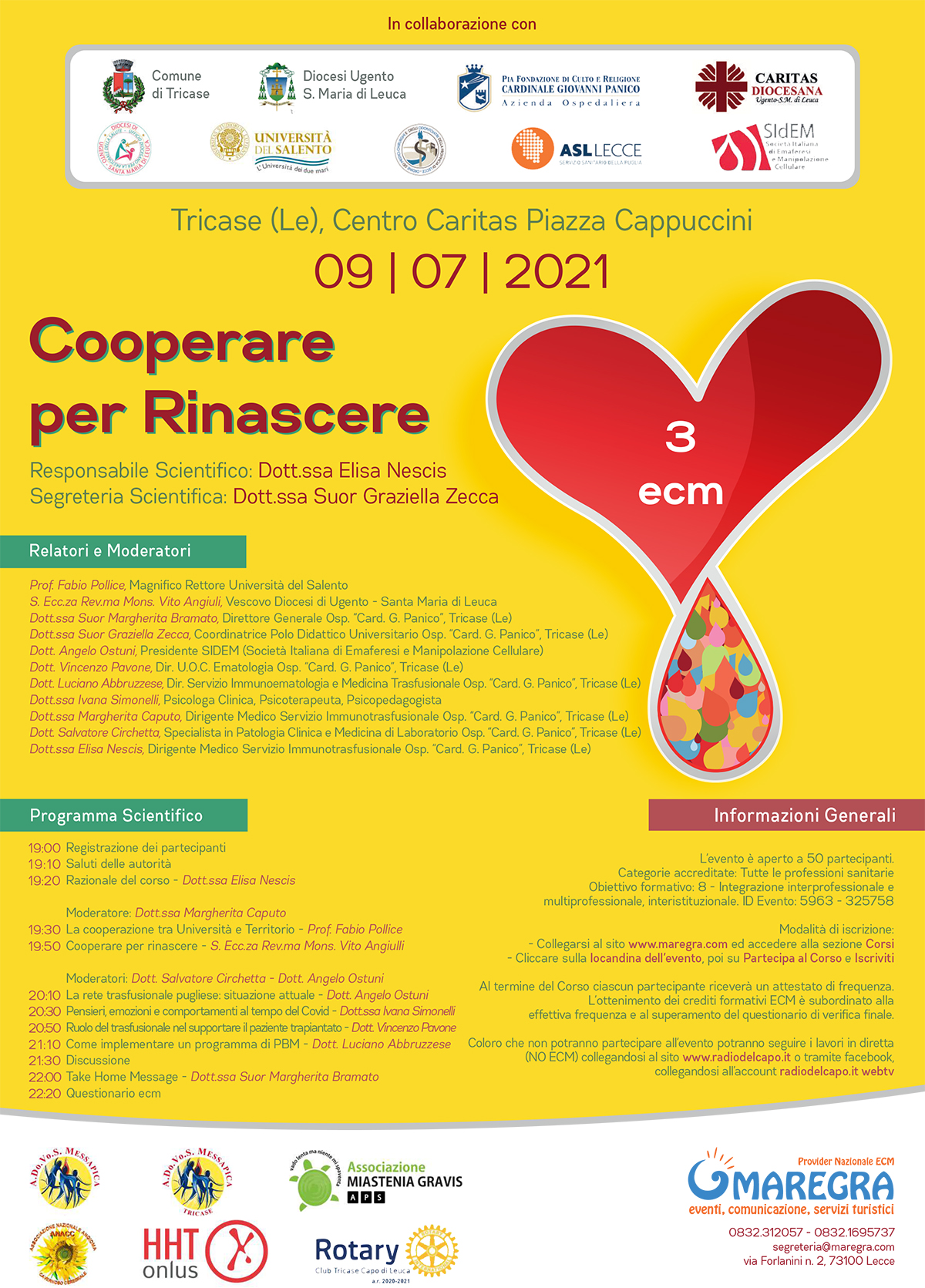 Relatori e Moderatori: Fabio Pollice, Magnifico Rettore Università del Salento; Mons. Vito Angiuli,Vescovo Diocesi di Ugento – Santa Maria di Leuca; Suor Margherita Bramato, Direttore Generale Osp. “Card. G. Panico” di Tricase; Suor Graziella Zecca, Coordinatrice Polo Didattico Universitario Osp. “Card. G. Panico”; Angelo Ostuni, Presidente SIDEM (Società Italiana di Emaferesi e Manipolazione Cellulare); Vincenzo Pavone, Dir. U.O.C. Ematologia Osp. “Card. G. Panico”; Luciano Abbruzzese, Dir. Servizio Immunoematologia e Medicina Trasfusionale Osp. “Card. G. Panico”; Ivana Simonelli, Psicologa Clinica, Psicoterapeuta, Psicopedagogista; Dott.ssa Margherita Caputo, Dirigente Medico Servizio Immunotrasfusionale Osp. “Card. G. Panico”; Salvatore Circhetta, Specialista in Patologia Clinica e Medicina di Laboratorio Osp. “Card. G. Panico”; Elisa Nescis, Dirigente Medico Servizio Immunotrasfusionale Osp. “Card. G. Panico”.