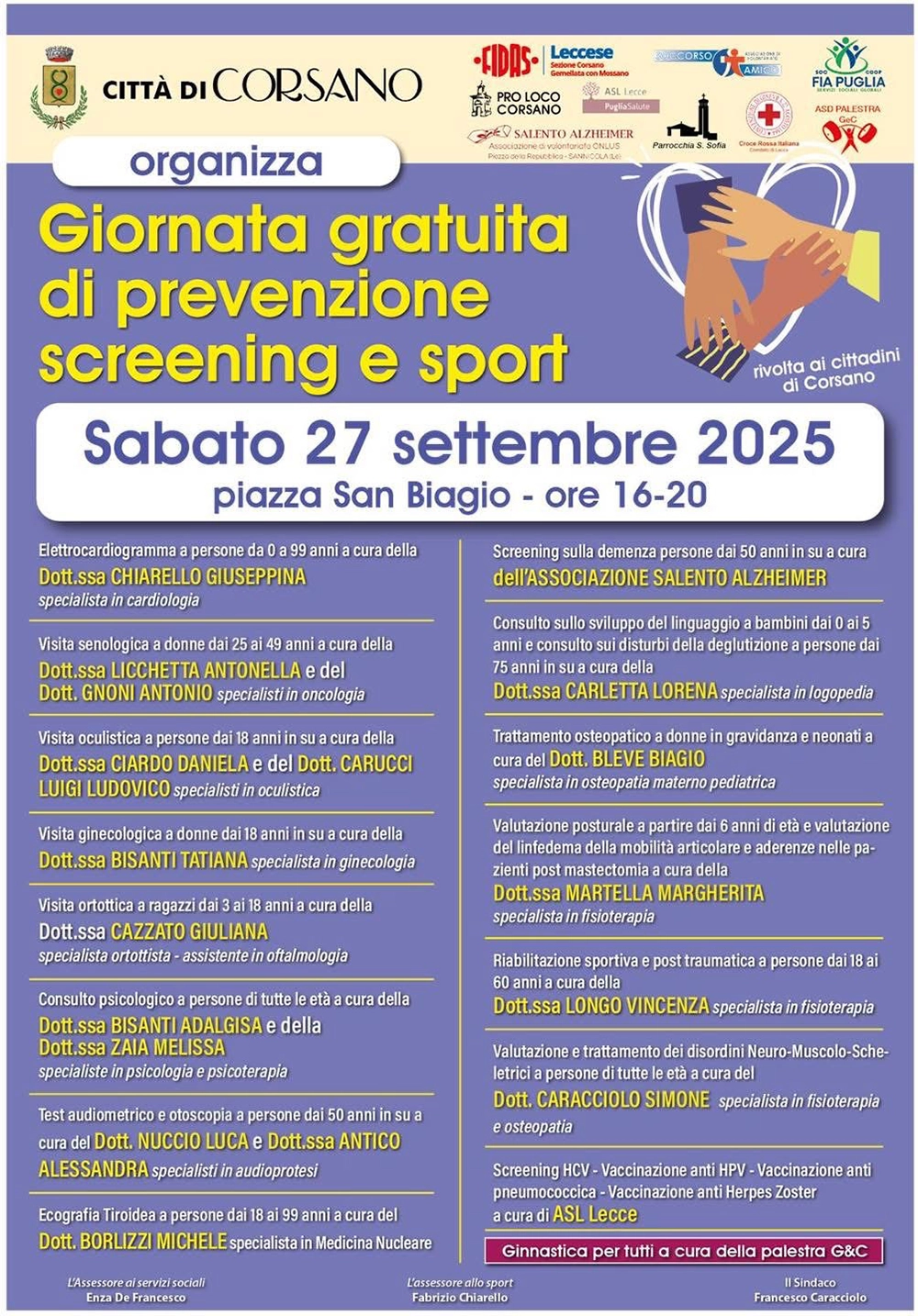 L’amministrazione comunale di Corsano, con la collaborazione di associazioni, enti e professionisti del settore sanitario, organizza una giornata gratuita di prevenzione, screening e sport dedicata alla salute e al benessere dei cittadini.
