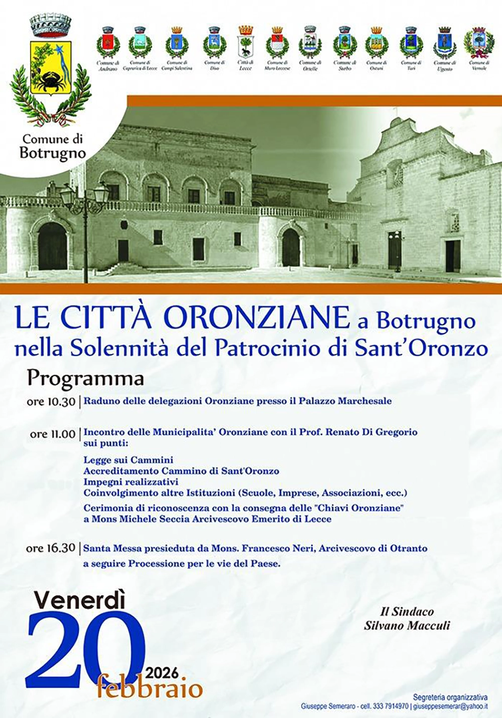 «Quest’anno si rafforza il percorso associativo delle Vie Oronziane con la sottoscrizione della Convenzione di adesione delle Municipalità di Ortelle e Ugento proprio nella solennità del patrocinio di Sant’Oronzo», dichiara il sindaco Silvano Macculi, «come da tradizione, avremo ospiti le Municipalità legate dal culto e dalla devozione verso il primo vescovo di Lecce».