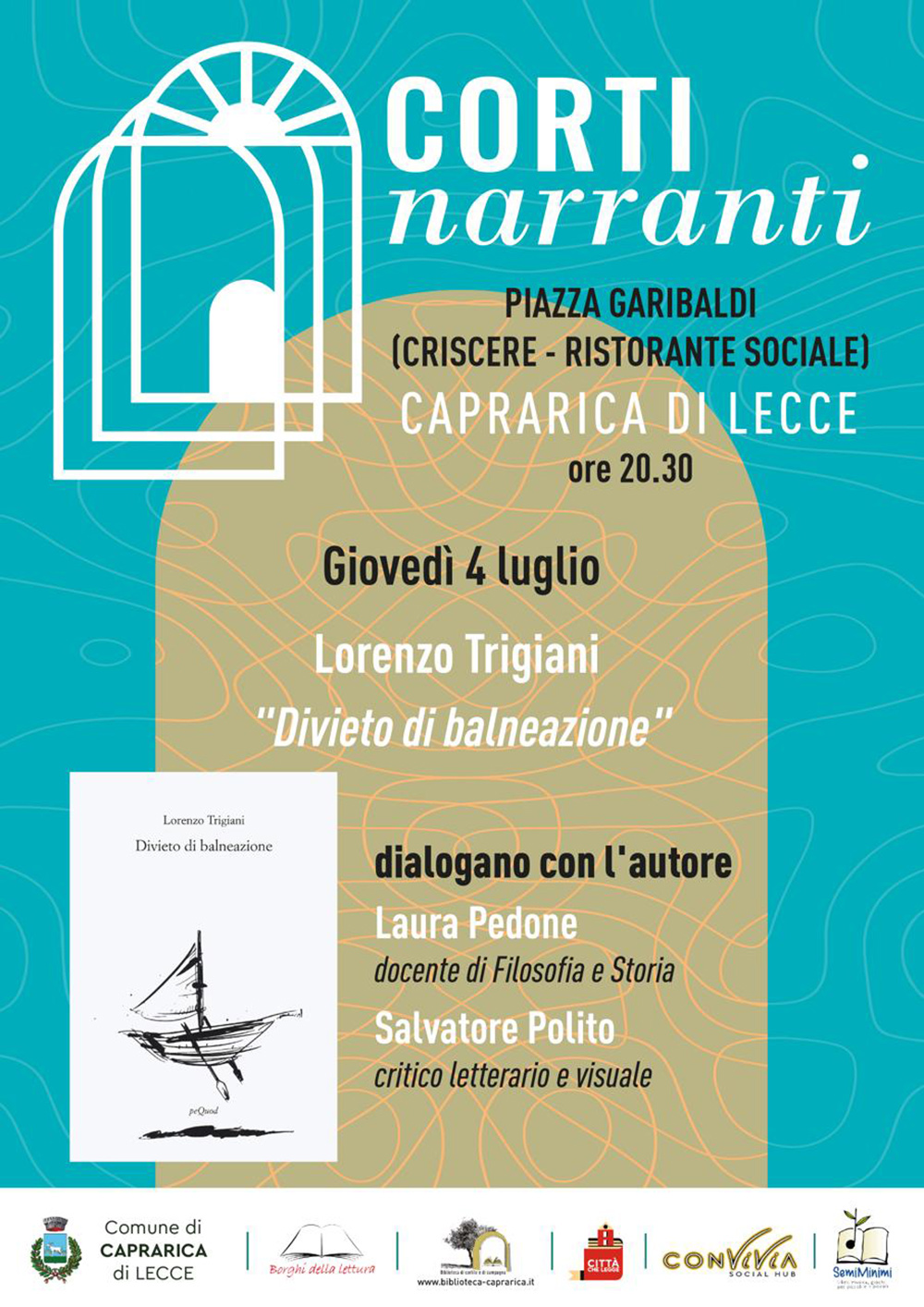 Si partirà giovedì 4 luglio (ore 20,30) con la raccolta di versi “Divieto di balneazione“, la quarta a firma di Lorenzo Trigiani, direttore creativo di Red Hot, storica agenzia di comunicazione pugliese, che si presenta al pubblico a dieci anni dall’ultima opera “Oli esausti“.