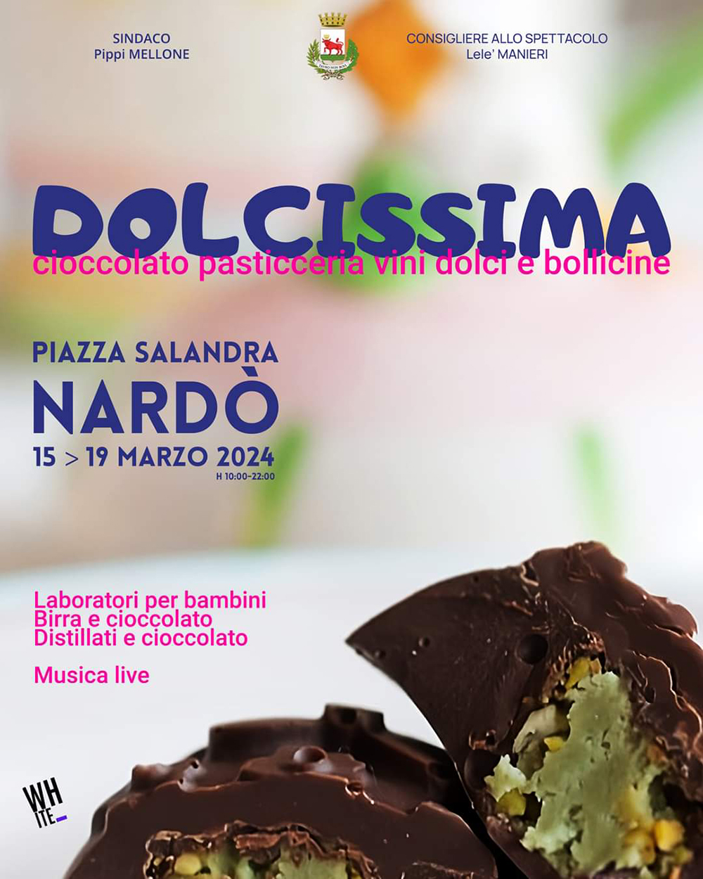 «Saranno quattro serate all’insegna della bontà», spiega il consigliere delegato allo spettacolo Lelè Manieri, «non solo con cioccolato e dolci, anche con vini e bollicine. Una bella occasione per scoprire nuovi sapori da ogni zona d’Italia, apprezzare l’arte dolciaria e vivere un’esperienza gourmet. Naturalmente nella nostra stupenda piazza. Aspettiamo tanti neretini e salentini per Dolcissima nel corso dei quattro giorni, partendo dai bambini che saranno coinvolti nei laboratori organizzati con le scuole».