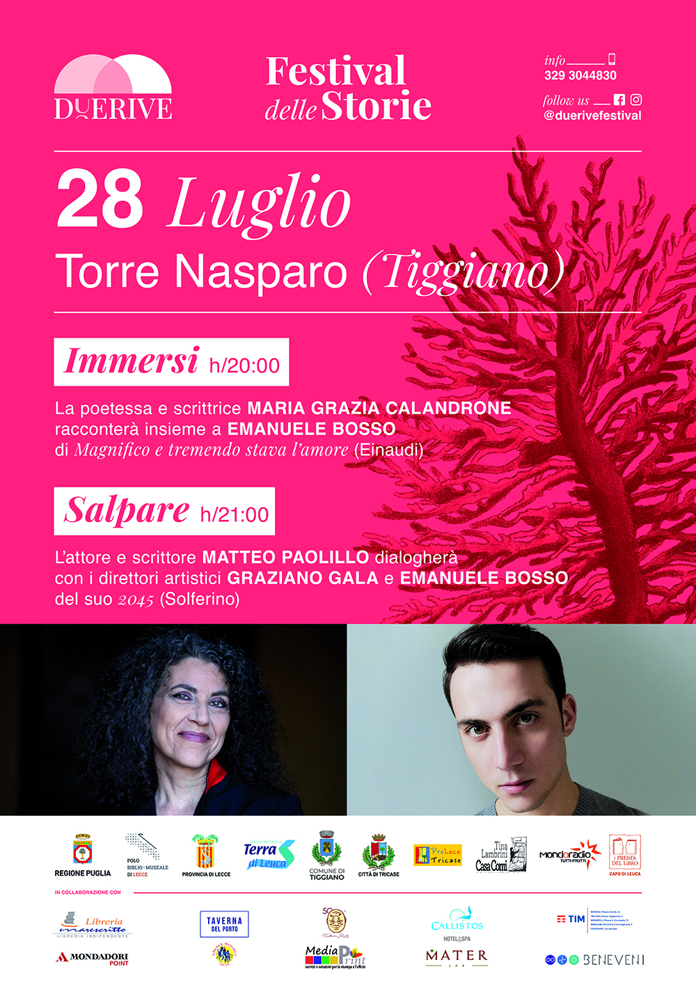 Terza serata, domenica 28 luglio, dalle ore 20, a Torre Nasparo (Tiggiano): l’evento sarà titolato “immergersi”, e la poetessa e scrittrice Maria Grazia Calandrone presenterà il suo romanzo Magnifico e tremendo stava l’amore (Einaudi) in dialogo con il direttore artistico Emanuele Bosso; a seguire, l’evento titolato “salpare”, con Matteo Paolillo, protagonista della fiction RAI Marefuori, che presenterà il suo libro d’esordio, 2045 (Solferino), e dialogherà con i direttori artistici Graziano Gala ed Emanuele Bosso.