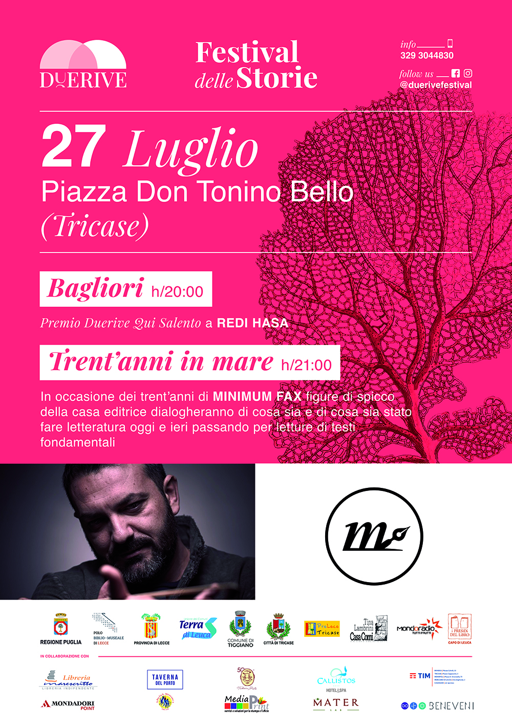 Seconda serata, sabato 27, dalle ore 20, in piazza Don Tonino Bello a Tricase: in un evento titolato “bagliori”, il musicista internazionale Redi Hasa riceverà il premio Duerive-QuiSalento, dialogando con i giornalisti Annibale Gagliani e Matteo Tangolo; a seguire, le celebrazioni per i trent’anni della casa editrice minimum fax con ospiti a sorpresa.