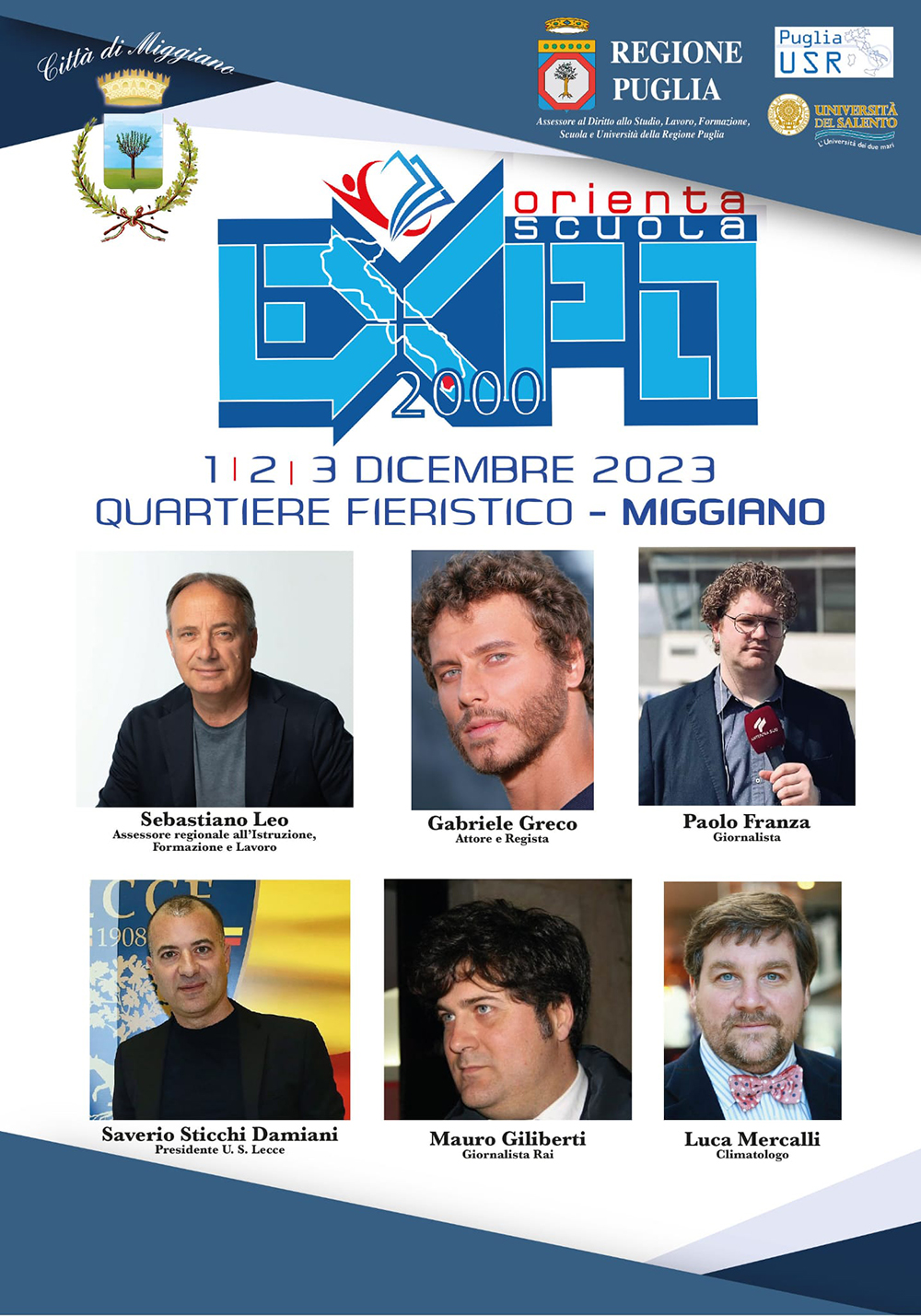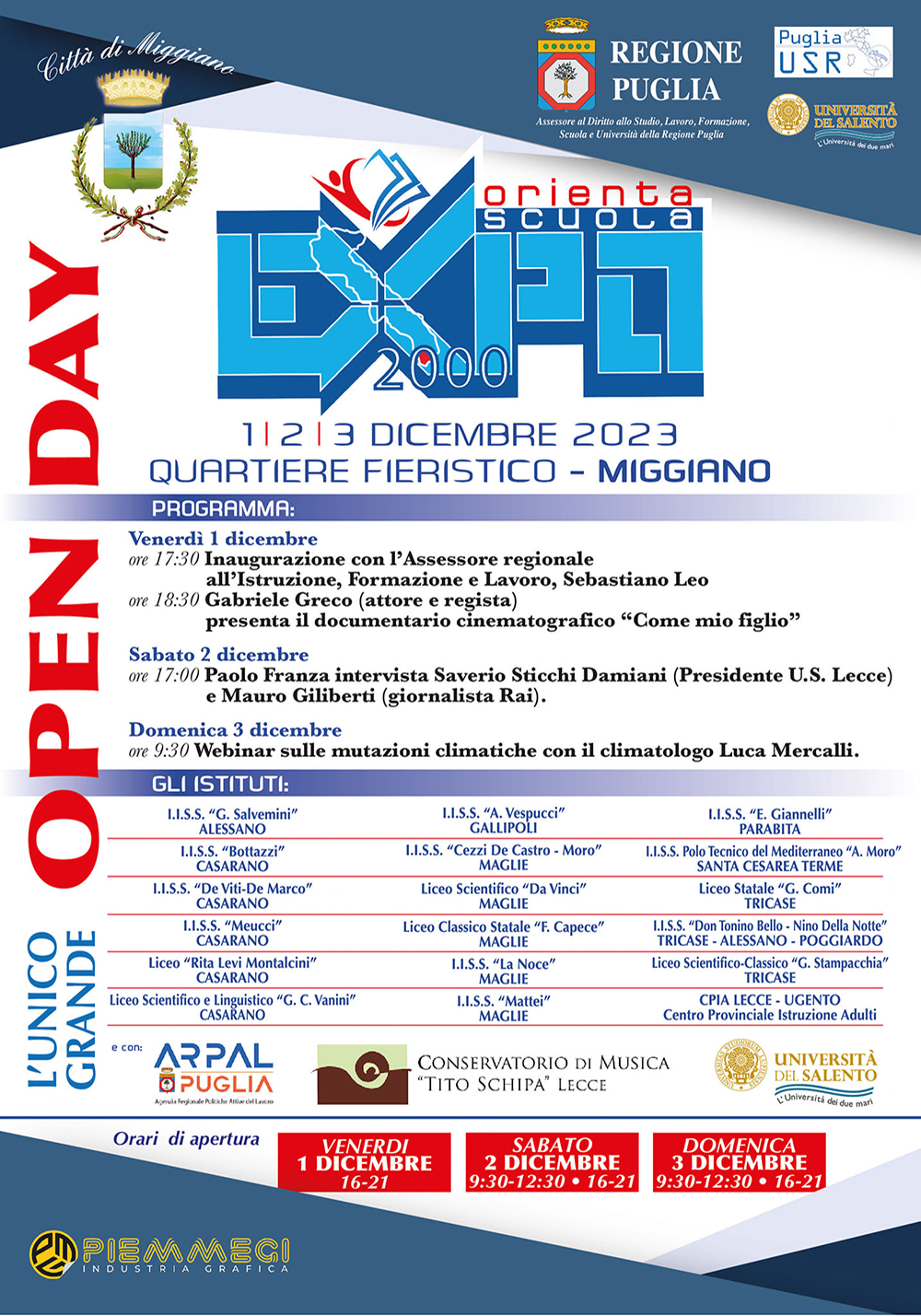 Accanto alle scuole ci saranno Università del Salento, Conservatorio di Musica ed Arpal (con lo sportello di orientamento al lavoro e con i laboratori di orientamento ai mestieri e alle professioni).