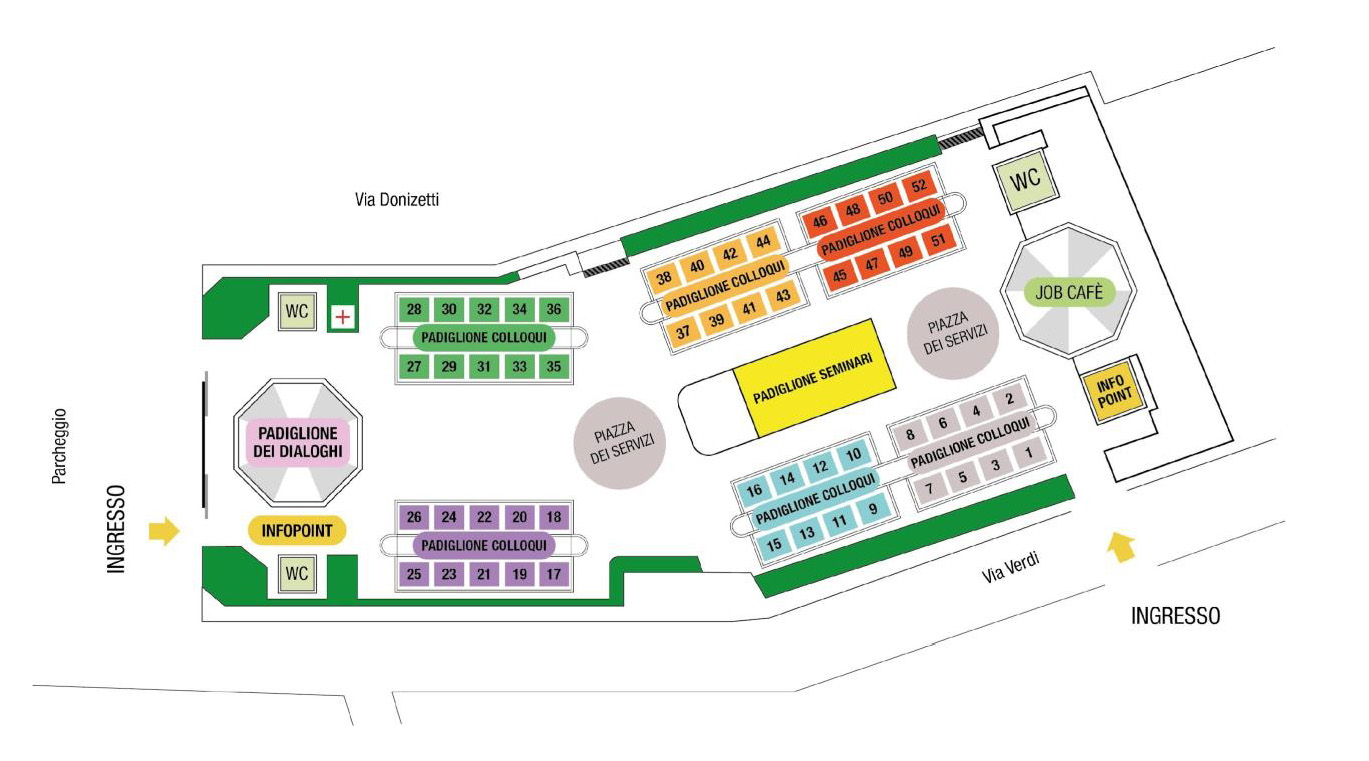 - Padiglioni colloqui (celeste, rosso, arancione, viola, verde): colloqui di lavoro, presentazioni aziendali, supporto redazione curriculum e candidature.