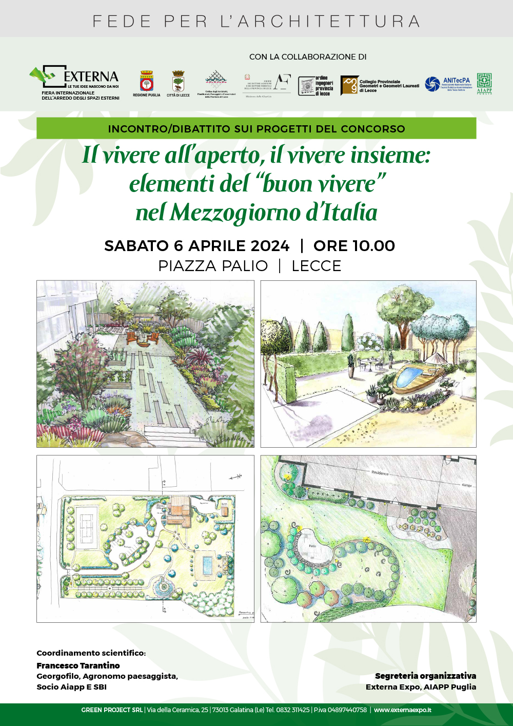 Come ogni anno nell’ambito di Externa – Fiera internazionale dell’arredo degli sazi esterni, si sono organizzati importanti eventi di studio e di formazione sul vivere all’aperto. In questa edizione assume tra gli altri rilevanza nazionale, una mostra di progetti di pubbliche amministrazioni, aziende e professionisti – Il vivere all’aperto, il vivere insieme -elementi del “buon vivere” nel Mezzogiorno d’Italia -. L’iniziativa, che ha ricevuto il patrocinio degli Ordini professionali dei dottori agronomi, degli architetti, degli ingegneri, del collegio dei geometri e dall’Anitec – Associazione Nazionale Italiana dei Tecnici della Pubblica Amministrazione – Ente del Terzo settore di preannuncia davvero interessante e molto partecipata.