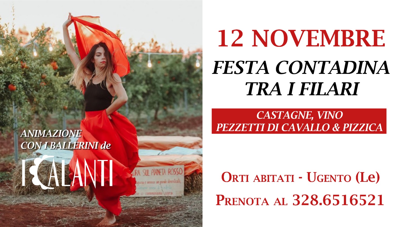 Sapori e danze della tradizione salentina riscalderanno l’autunno per la Festa contadina tra i filari in programma domenica 12 novembre: l’appuntamento è a Ugento, tra i melograni e l’uliveto illuminato di Orti abitati (sp 325, svincolo via S. Pantaleo).