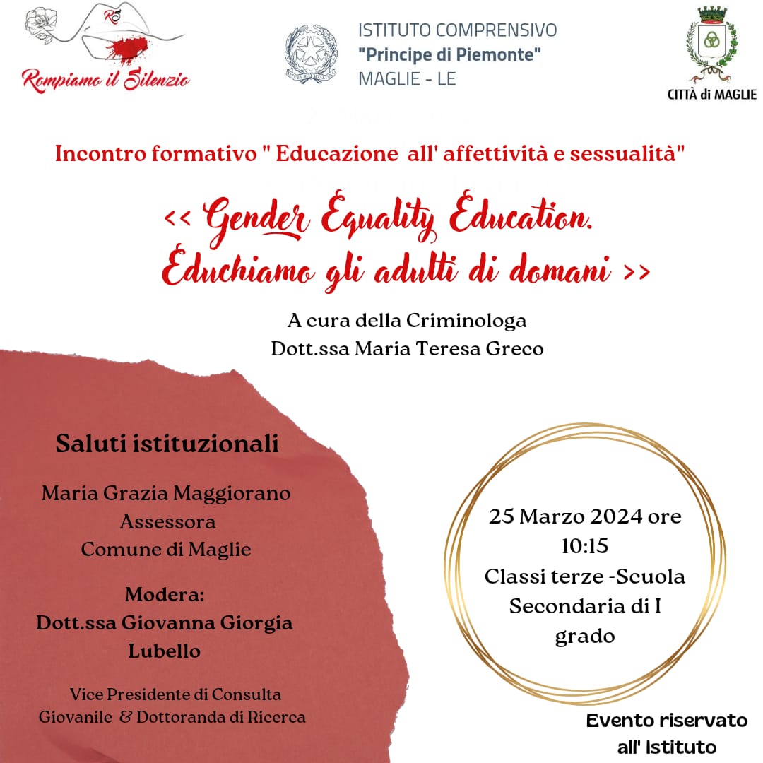 Lunedì 25 marzo, a partire dalle 10,15, presso l’Istituto comprensivo “Principe di Piemonte” l’incontro formativo “Educazione all’affettività e sessualità» a cura di “Rompiamo il silenzio”, progetto e sportello salentino creato da Maria Teresa Greco, sociologa in Crimine e devianza, sociologa in ricerca sociale politiche della sicurezza e criminalità, esperta in criminologia, criminalistica, investigazione e psicologia giuridica.