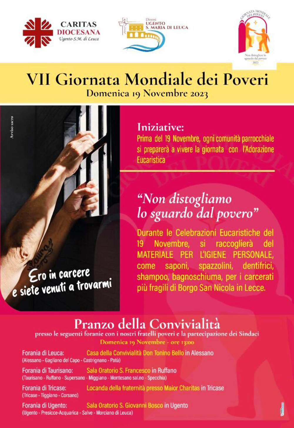 Un pranzo di convivialità verrà organizzato nelle quattro foranie: Forania di Leuca, presso la Casa della Convivialità “Don Tonino Bello” ad Alessano (Comunità parrocchiali di Alessano, Gagliano del Capo, Castrignano del Capo e Patù); Forania di Taurisano, presso la Sala Oratorio San Francesco a Ruffano (Comunità parrocchiali di Taurisano, Ruffano, Supersano, Miggiano, Montesano Salentino e Specchia); Forania di Tricase, presso la Locanda della fraternità presso la Maior Charitas a Tricase (Comunità parrocchiali di Tricase, Tiggiano e Corsano); Forania di Ugento, presso la Sala Oratorio della Parrocchia di S. Giovanni Bosco (Comunità parrocchiali di Ugento, Presicce – Acquarica, Salve e Morciano di Leuca). Sarà anche sarà raccolto materiale per l’igiene personale dei carcerati