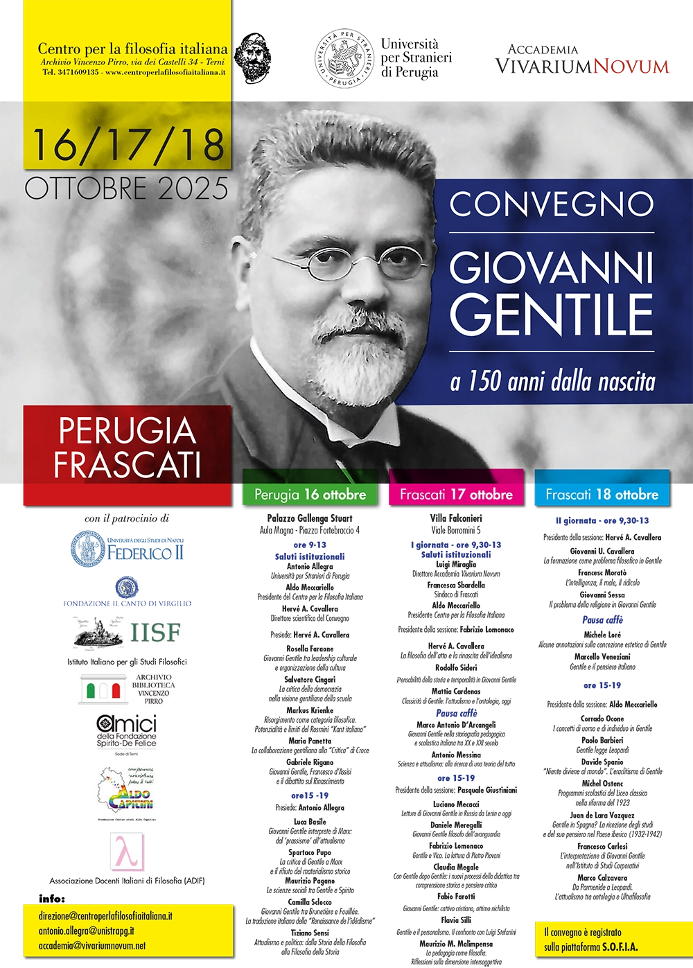 Il convegno Giovanni Gentile a 150 anni dalla nascita si svolgerà da giovedì 16 a sabato 18 ottobre, articolandosi su due sedi principali.