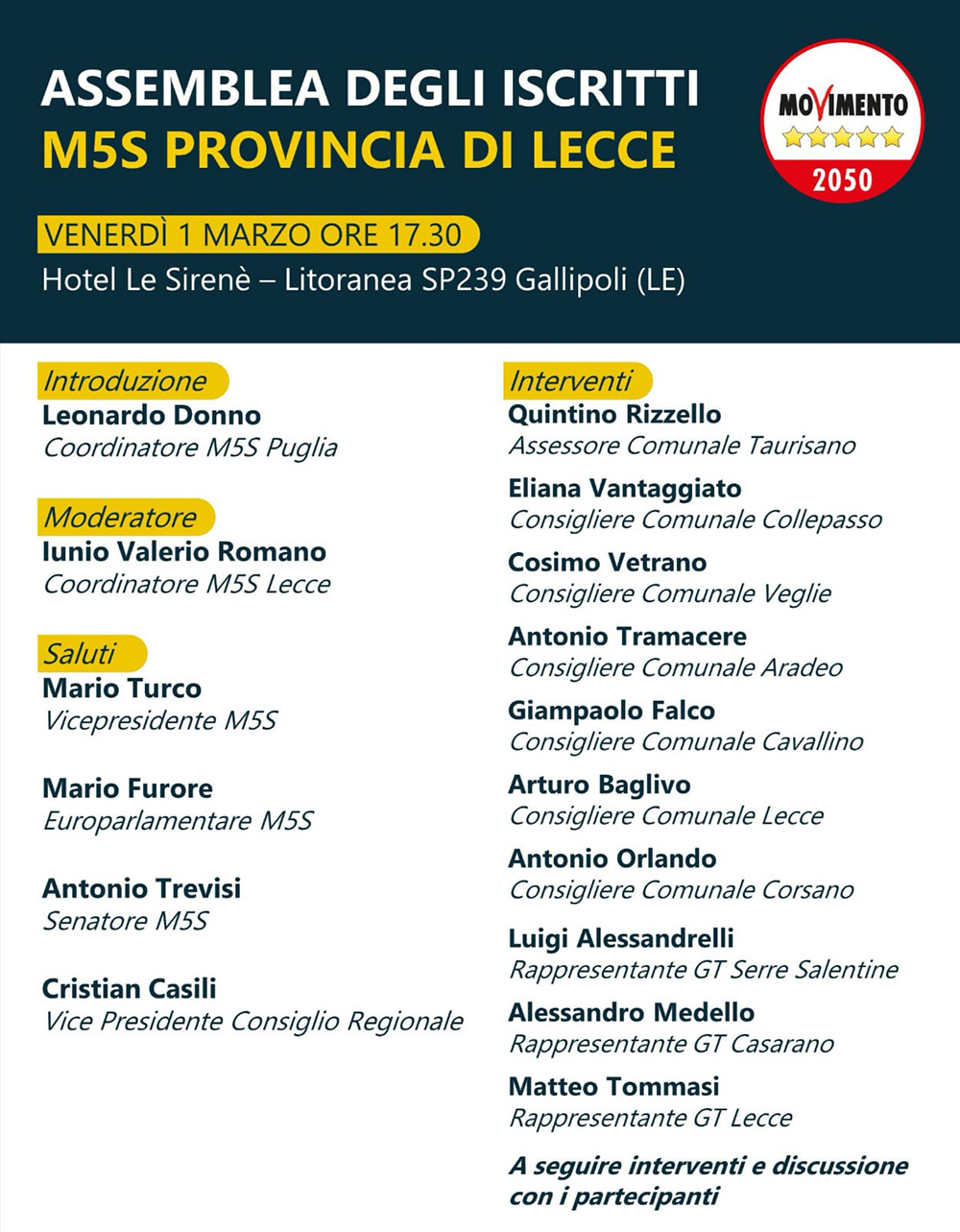 L’incontro vedrà la partecipazione, oltre che del coordinatore regionale on. Leonardo Donno, del vice presidente M5S sen. Mario Turco, dell’europarlamentare on. Mario Furore, del sen. Antonio Trevisi, del vice presidente del Consiglio regionale pugliese Cristian Casili e di tutti i consiglieri comunali M5S della provincia.