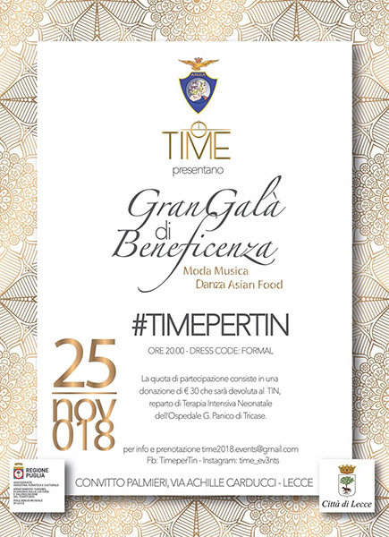 Danza, musica, asian food e tanta bellezza animeranno il Gran Galà di Beneficienza #TIMEFORTIN che si terrà domenica 25 novembre al Convitto Palmieri di Lecce.