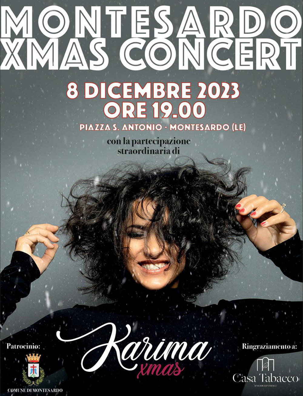 Casa Tabacco, nuovo indirizzo dell’ospitalità di alta gamma di prossima apertura a Montesardo e proprietà dell’imprenditore di origini salentine Paolo Bleve, rende omaggio alla cittadinanza con il concerto di Natale, in Piazza Sant’Antonio che vede, come ospite d’eccezione la cantante Karima, volto noto della musica jazz a livello nazionale.
