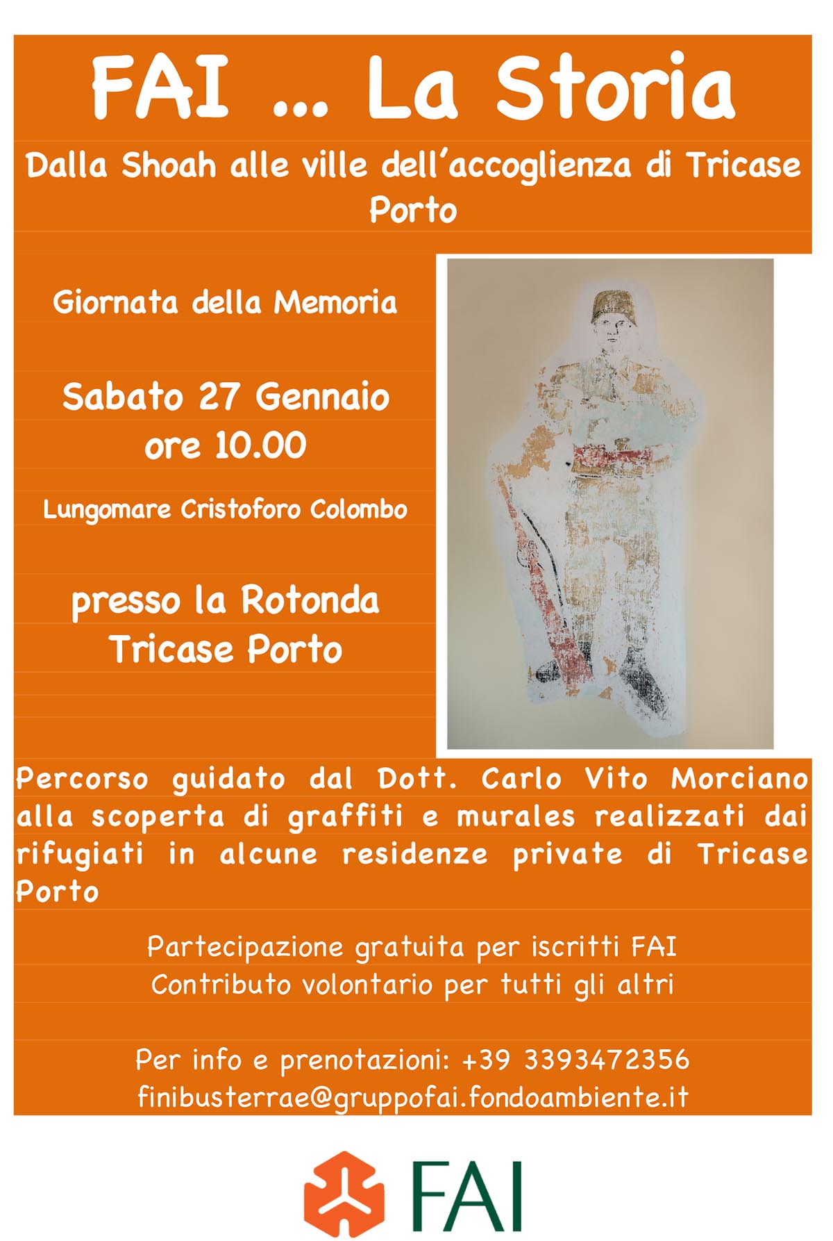 Operativo da subito il FAI Gruppo “Finibus Terrae”: in programma la prima iniziativa già sabato 27 gennaio, in occasione della Giornata della Memoria, con l’evento “Dalla Shoah alle ville dell’accoglienza di Tricase Porto”: percorso guidato dal Dott. Carlo Vito Morciano alla scoperta di graffiti e murales realizzati dai rifugiati in alcune residenze private di Tricase Porto.