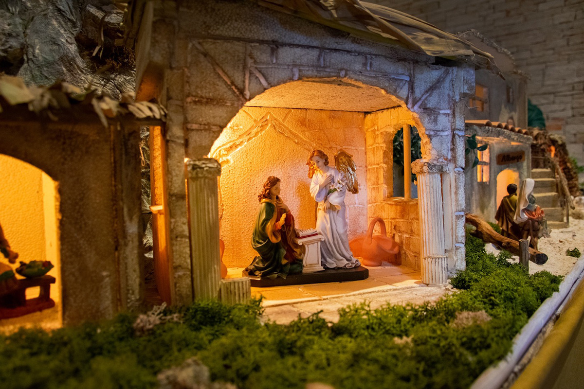 Un Presepe natalizio racconta l’annuncio della nascita di Gesù, il bambino deposto nella mangiatoia, la presenza di angeli e pastori con doni.