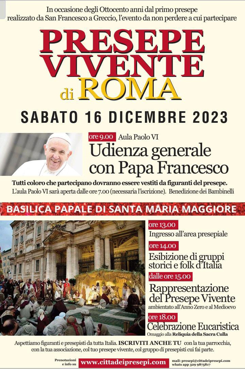 Sabato 16 dicembre il Presepe Vivente di Tricase sarà in udienza generale in Vaticano, incontrando sua santità Papa Francesco, per la celebrazione degli ottocento anni dal primo presepe realizzato da San Francesco a Greccio. Dopo l’udienza con Papa Bergoglio nell’aula Paolo VI, una rappresentanza di oltre 50 figuranti del Presepe Vivente, parteciperà in costume alla rappresentazione del Presepe Vivente ambientato all’Anno Zero presso la Basilica Papale di Santa Maria Maggiore a Roma.