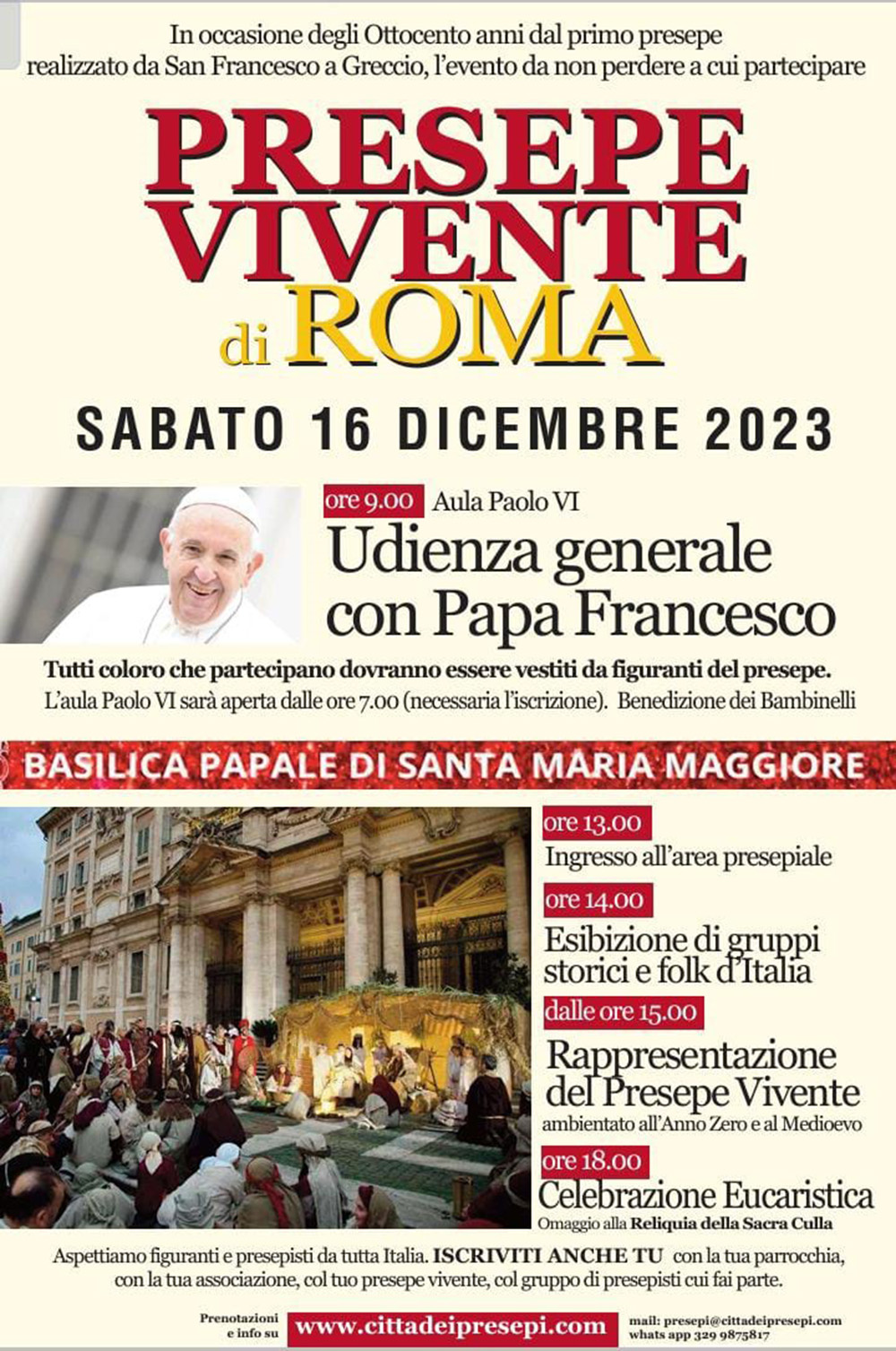 Altra novità di quest’anno: sabato 16 dicembre, una nutrita rappresentanza dei figuranti del Presepe Vivente, porterà la magia di Monte Orco e della Betlemme d’Italia alla corte di Papa Francesco a Roma.