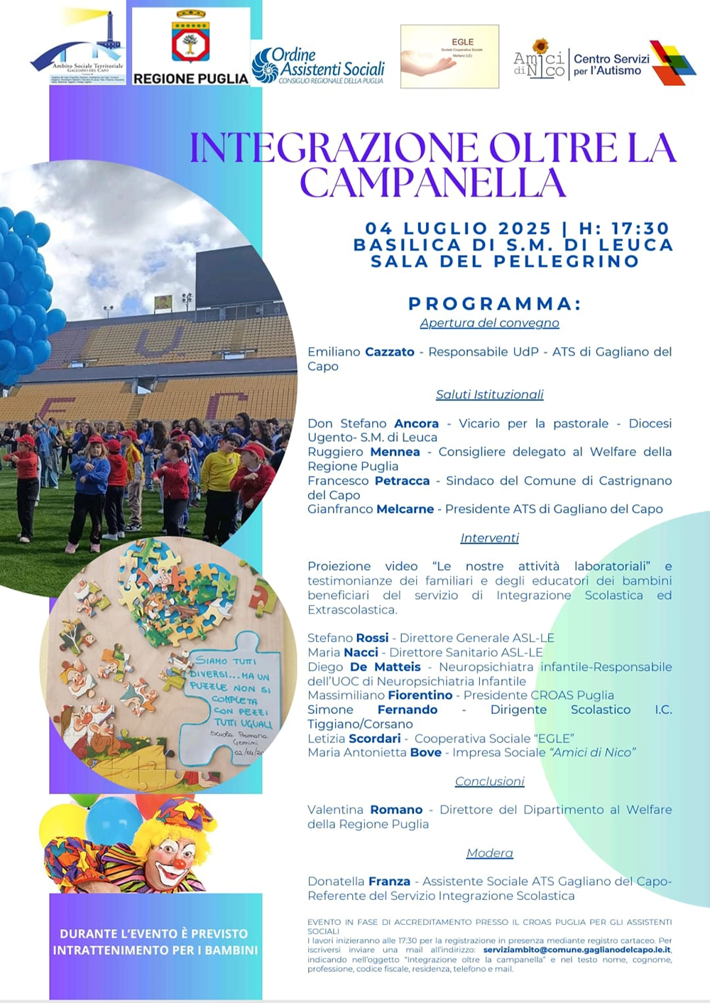 Presso la Sala del Pellegrino della Basilica di Santa Maria di Leuca, si terrà il convegno dal titolo “Integrazione oltre la campanella”, promosso dall’Ambito Territoriale Sociale di Gagliano del Capo, con il patrocinio della Regione Puglia, dell’Ordine degli Assistenti Sociali – Consiglio Regionale della Puglia, e la collaborazione delle cooperative sociali Egle e Amici di Nico.