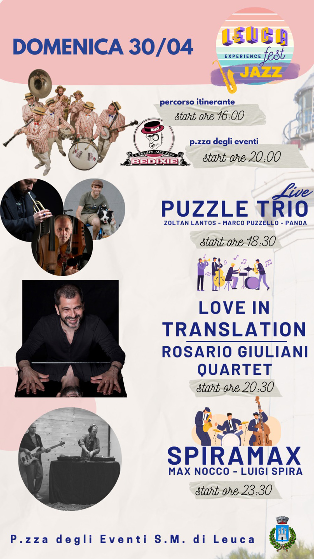 Alle 16 prenderà il via lo spettacolo itinerante della Bedixie Band che continuerà a suonare dalle 20 in piazzetta degli eventi, teatro anche degli altri due concerti della serata: quello dei Puzzle Trio (Zoltan Lantos, Marco Puzzello, Panda – start ore 18,30) e l’attesa esibizione del Rosario Giuliani Quartet (20,30) con Love in Translation.