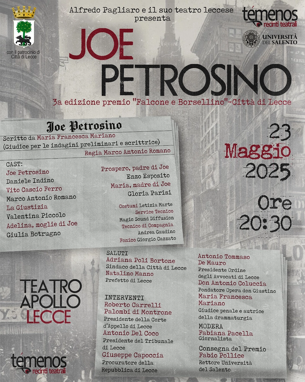 Venerdì 23 maggio, in occasione della terza edizione del “Premio Falcone e Borsellino – Città di Lecce“, al Teatro Apollo andrà in scena “Joe Petrosino“, la nuova produzione Tėmenos del “Recinto Legalità“.