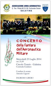 L’Associazione Arma Aeronautica – Sezione di Galatina, al fine di promuovere e valorizzare la cultura nelle sue diverse forme espressive nel segno dell’amicizia e dell’aggregazione, ha organizzato un concerto che vedrà l’esibizione della Fanfara del Comando Scuole dell’Aeronautica Militare presso il Circolo Tennis in Contrada Guidano a partire dalle ore 21 domani, mercoledì 23 luglio.