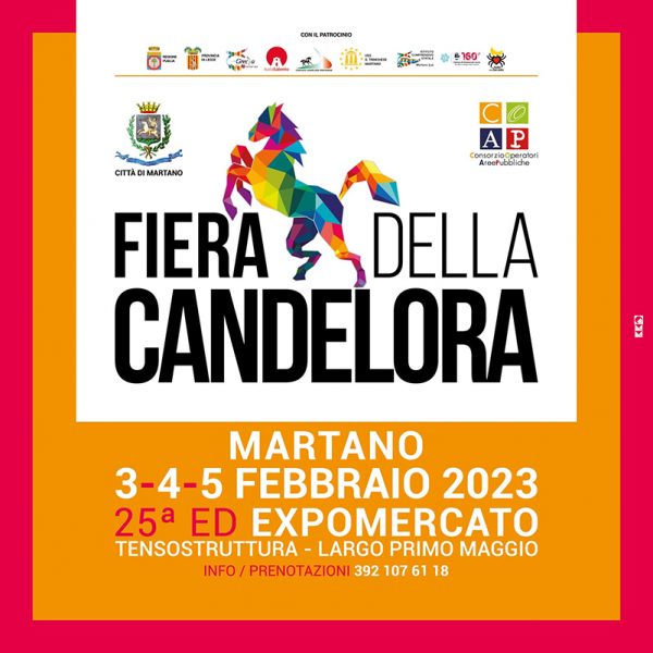L’evento, promosso dal Comune di Martano e dal Consorzio Operatori Aree Pubbliche, con il patrocinio, tra gli altri, della Provincia di Lecce, si svolgerà il 3-4-5 febbraio, presso Expomercato, tensostruttura in Largo Primo Maggio, preceduta dagli eventi religiosi di giovedì 2 febbraio, ricorrenza della Candelora (che chiude le celebrazioni natalizie e apre il cammino verso la Pasqua, e che prevede la benedizione di ceri e candele nelle chiese).