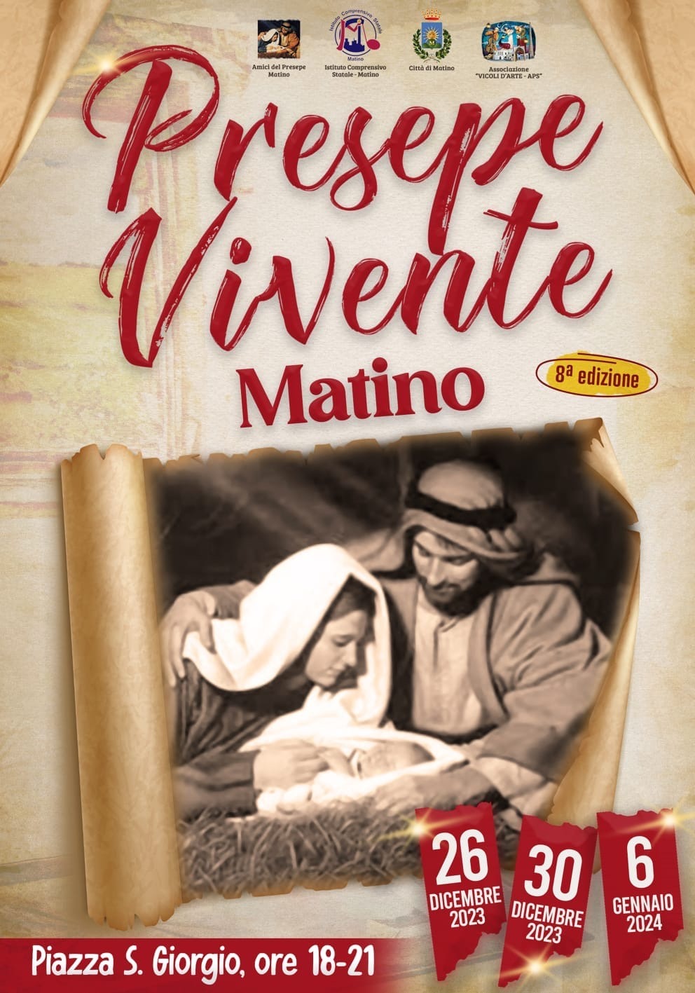 Torna in scena, a Matino, l’ottava edizione del “Presepe Vivente”. L’evento è in programma per il 26 , il 30 dicembre 2023 e il 6 gennaio 2024, dalle ore 18 alle 21 (con ingresso da piazza San Giorgio). L’organizzazione è curata dall’associazione “Amici del Presepe” in collaborazione con l’associazione “Vicoli d’Arte A.p.s.”, l’Istituto Comprensivodella città e il Comune di Matino.