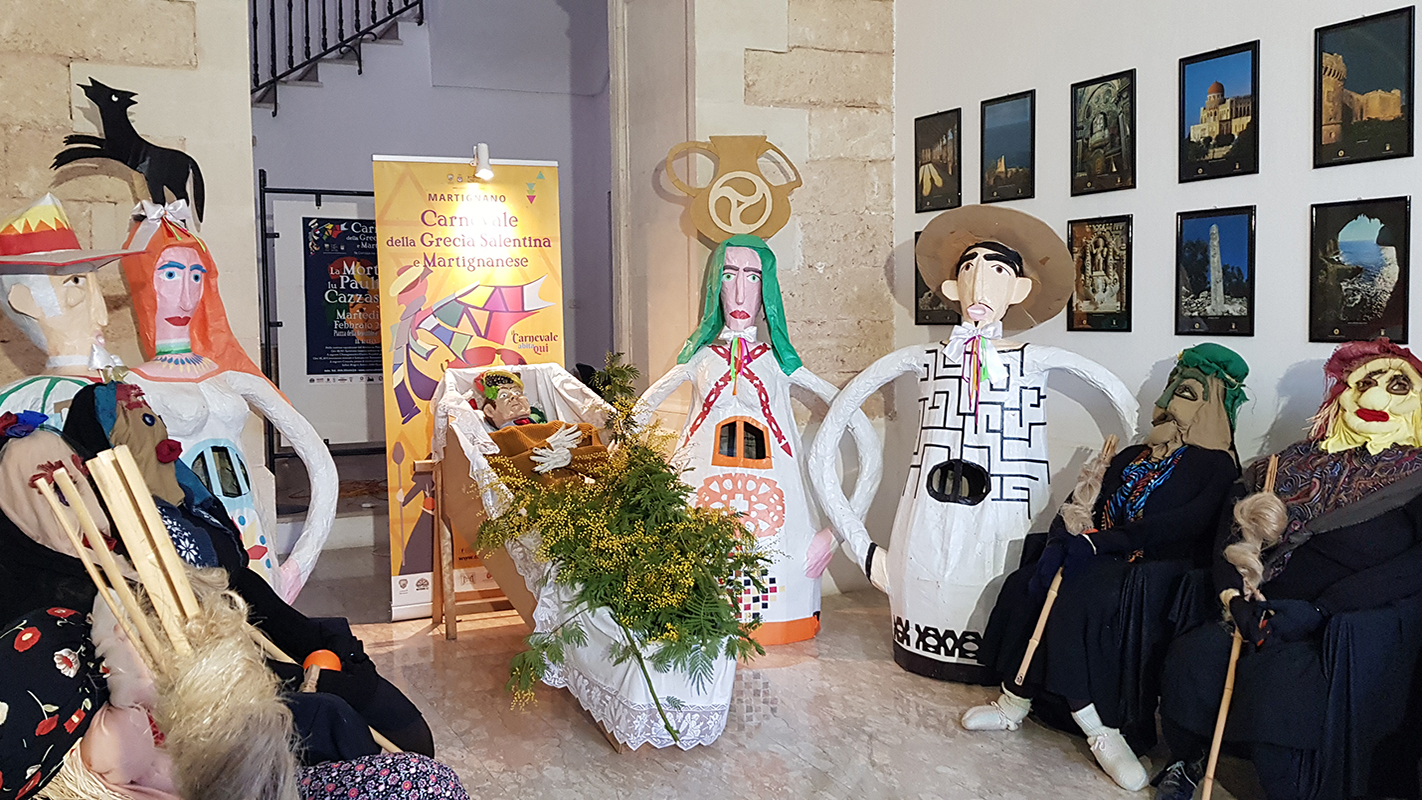 La comunità di Martignano e tutti coloro che vorranno liberamente parteciparvi saranno coinvolti con i grotteschi riti funebri de La Morte te lu Paulinu Cazzasassi, dalla veglia Chiangimorti, al corteo funebre (ore 18.30 circa partenza dalla camera ardente allestita a Piazza Palmieri), allo spettacolo teatrale in vernacolo (ore 19,30 circa), al successivo tradizionale pasto consolatorio (Lu Consulu!), con la lettura del testamento e infine con il rogo dell’amato Paulinu e l’arrivo delle Quaremma (Saracosteddha in lingua grika), le tetra figura che rappresenta la Quaresima, con i loro simbolismi (dall’arancia amara con le sette penne di gallina, al fuso e alla canocchia) che richiamano tra l’altro al trascorrere del tempo mesto fino alla Pasqua e alla caducità della vita appesa.