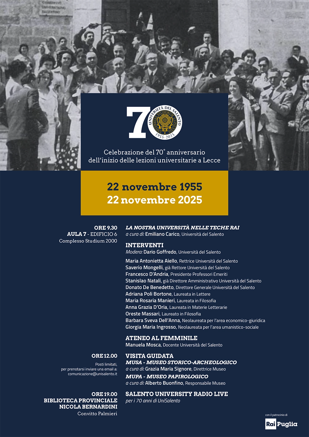 I posti per le visite sono limitati, è quindi consigliata la prenotazione all’indirizzo comunicazione@unisalento.it