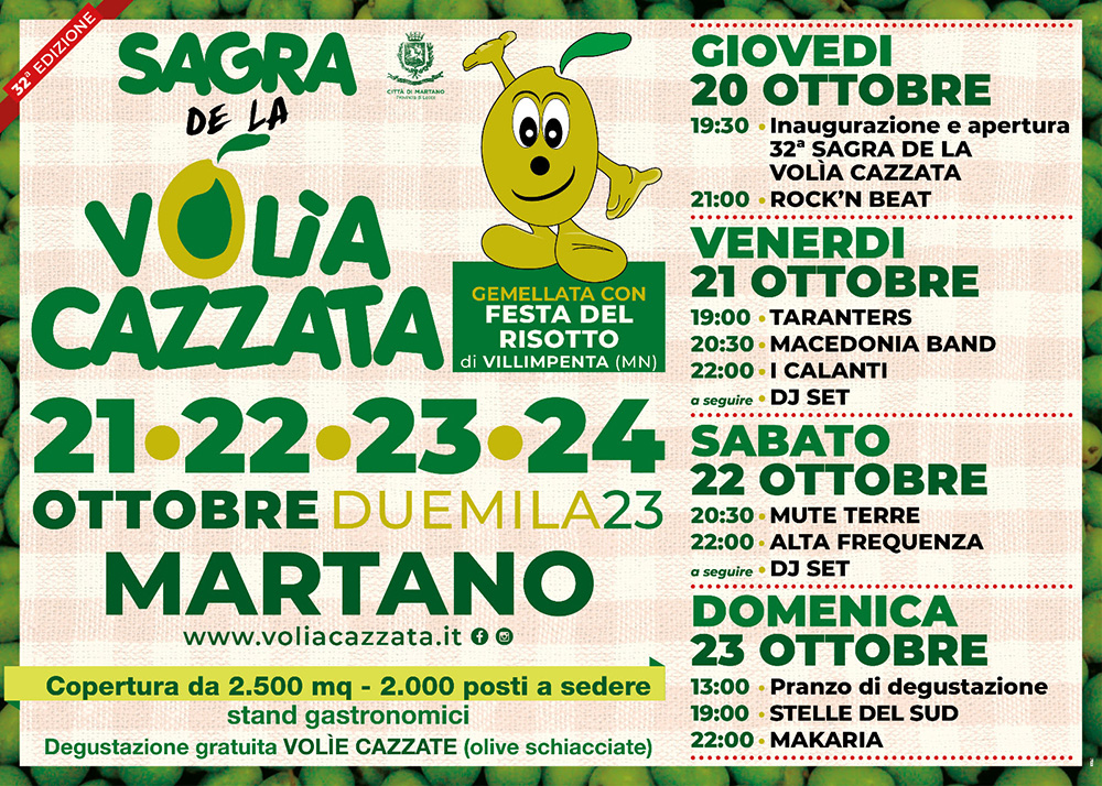 Organizzata dall’Associazione “Cosimo Moschettini”, con il patrocinio della Provincia di Lecce – Salento da Amare e del Comune di Martano, torna la Sagra de la Volìa Cazzata, la più grande festa dedicata alle olive.