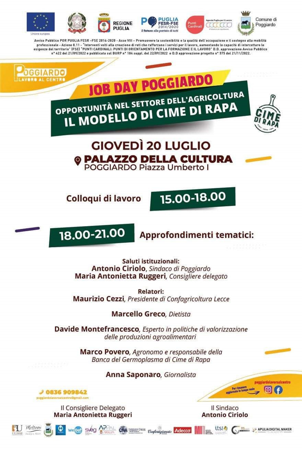 Un Job Day darà una panoramica sulle opportunità per i giovani agricoltori, la riconversione dei terreni verso la biodiversità dopo il problema xylella e le opportunità offerte dalla catena ristorativa Cime di Rapa Street Food di coltivare le varietà proposte.