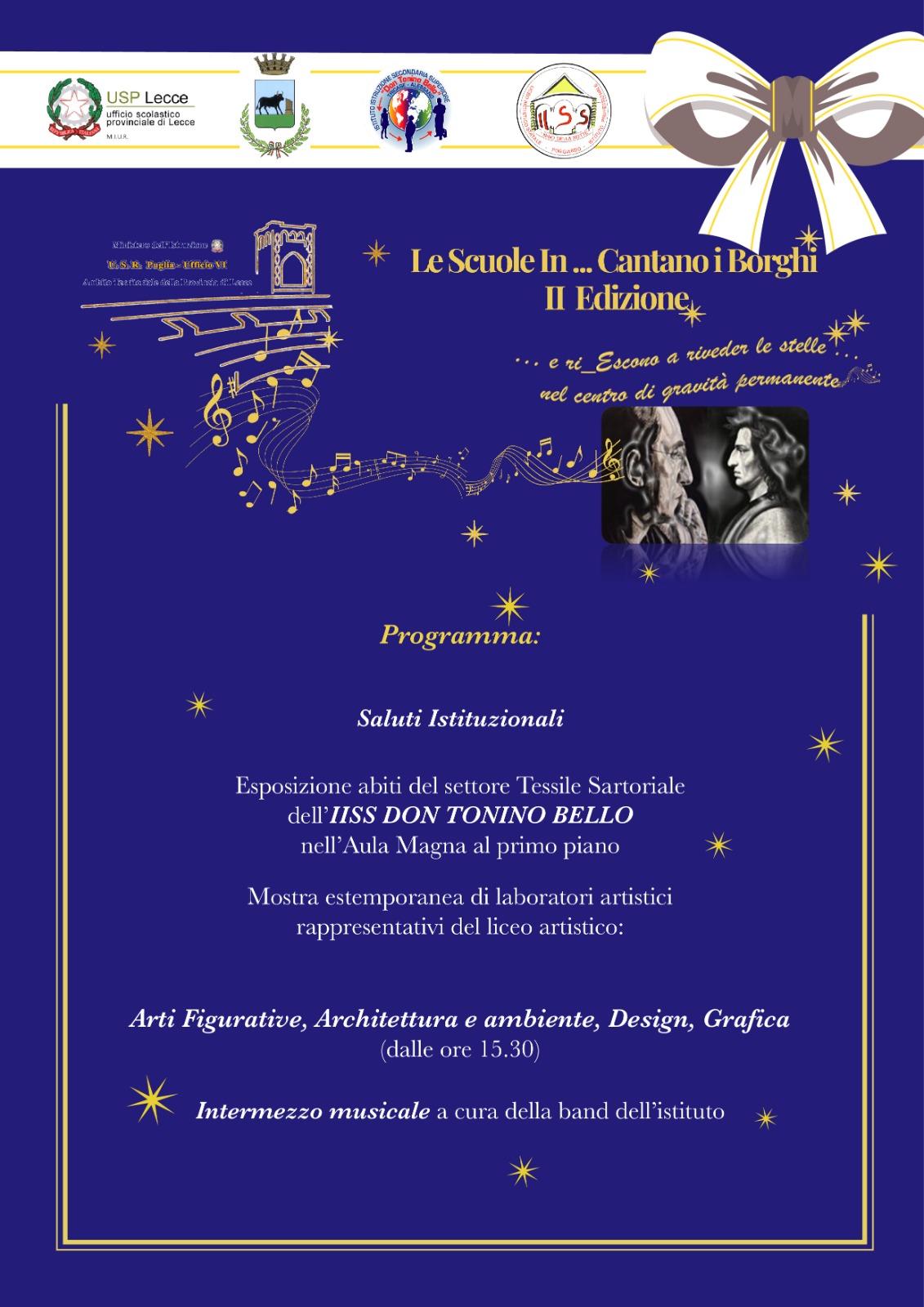 Nell’ambito delle iniziative per la seconda edizione del progetto “Le scuole in… cantano i Borghi”, progetto dell’Unione Scolastica Provinciale finanziato dalla Regione Puglia, appuntamento nel tardo pomeriggio presso la sede del Liceo Artistico “Nino della Notte” di Poggiardo.